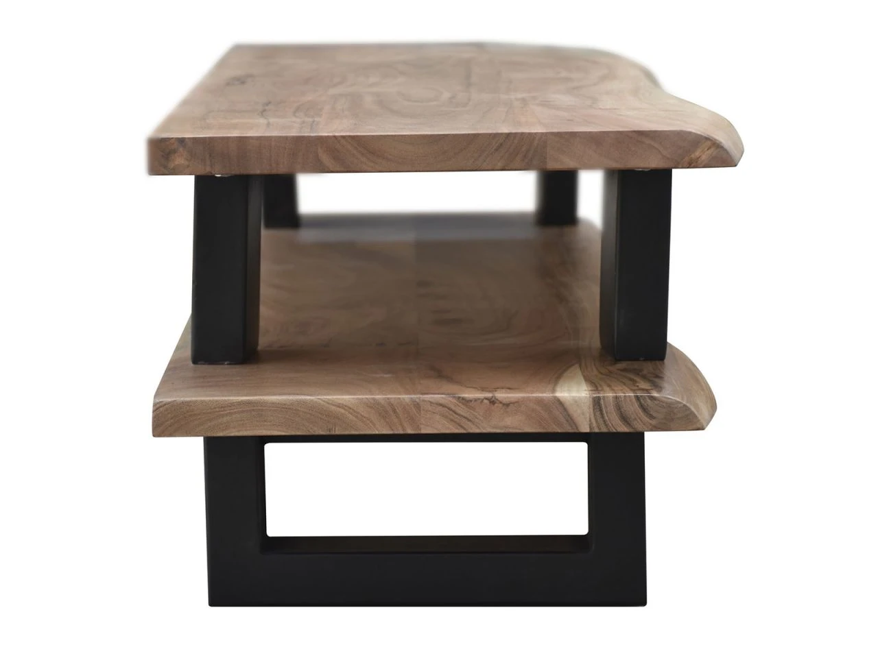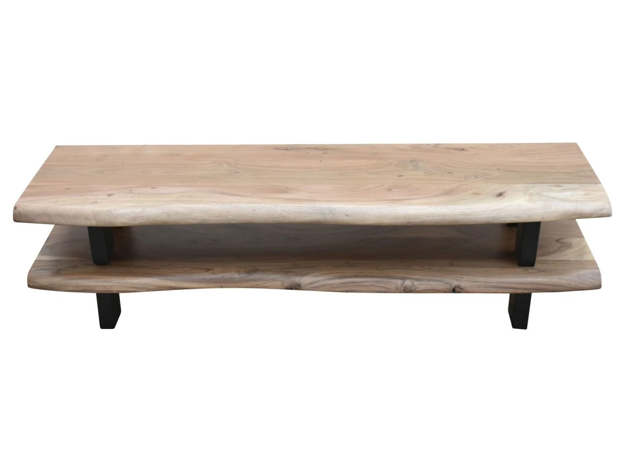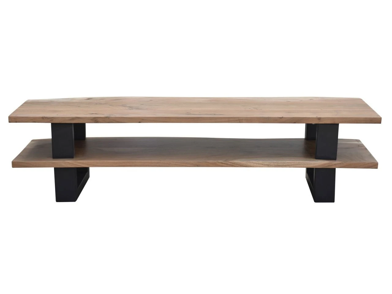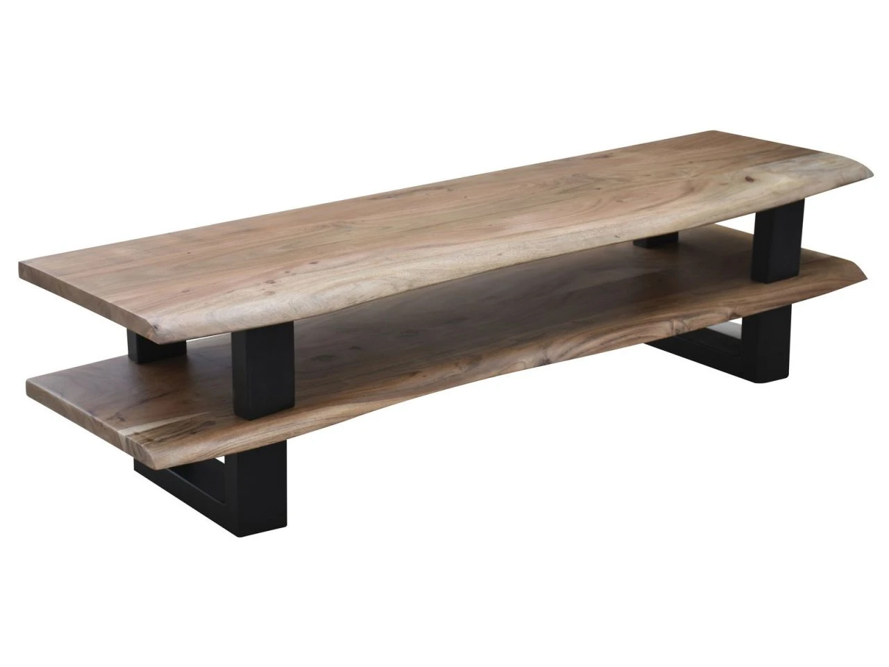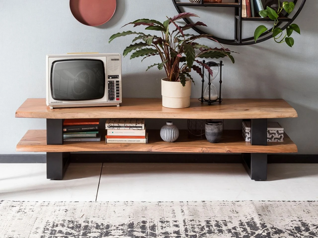 Praktisches Lowboard mit natürlichem Charme: Das offen gestaltete TV-Board bietet viel Ablagefläche für TV, HiFi Geräte und dekorative Accessoires. Mit einer Breite von 140 cm ist das Lowboard geeignet für eine TV Größe von bis zu 58“. Zwei Bretter mit echter Baumkante sorgen für eine hochwertige Optik und einen warmen Look. Durch lebendige Maserung, dynamische Formen und verschiedene Farbabstufungen wird jedes Stück zum Unikat. Verbunden werden beide Bretter des Lowboardes mit Metallbeinen, so dass durch die Kombination von warmem Holz und coolem Metall ein industriell-moderner Gesamtlook entsteht, der zu vielen Einrichtungsstilen passt. Mit der luftigen Optik des Boardes wird ein klassisches TV-Möbel neu interpretiert – Ob skandinavisch, im modernen Factory Look oder ganz klassisch – das Lowboard kann mühelos in viele Interior-Stile integriert werden und wird garantiert zum rustikalen Blickfang im Wohnraum. Weiterer Pluspunkt: Durch das durchgehende 360°-Design ist das Lowboard auch freistehend im Raum platzierbar.