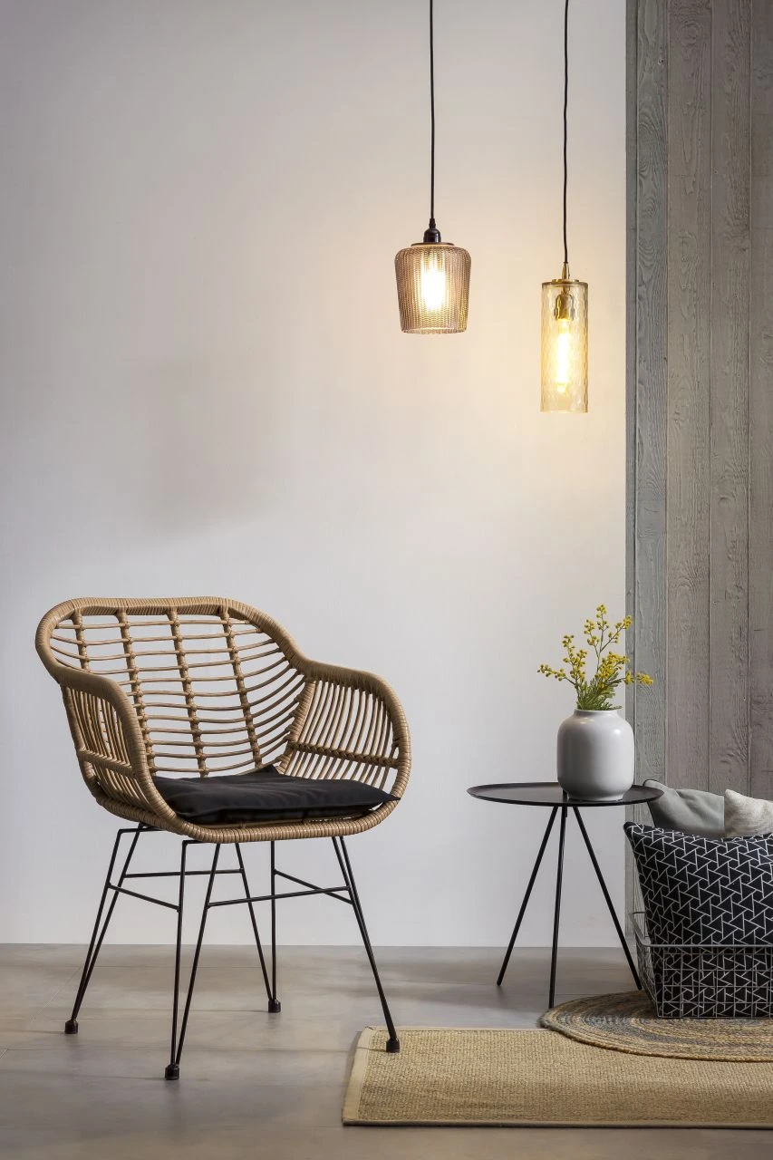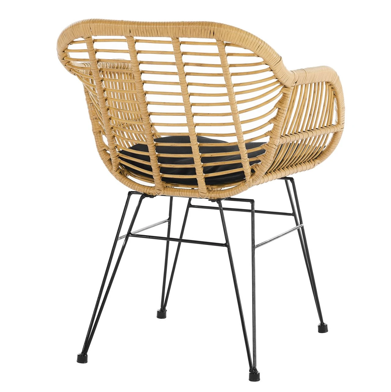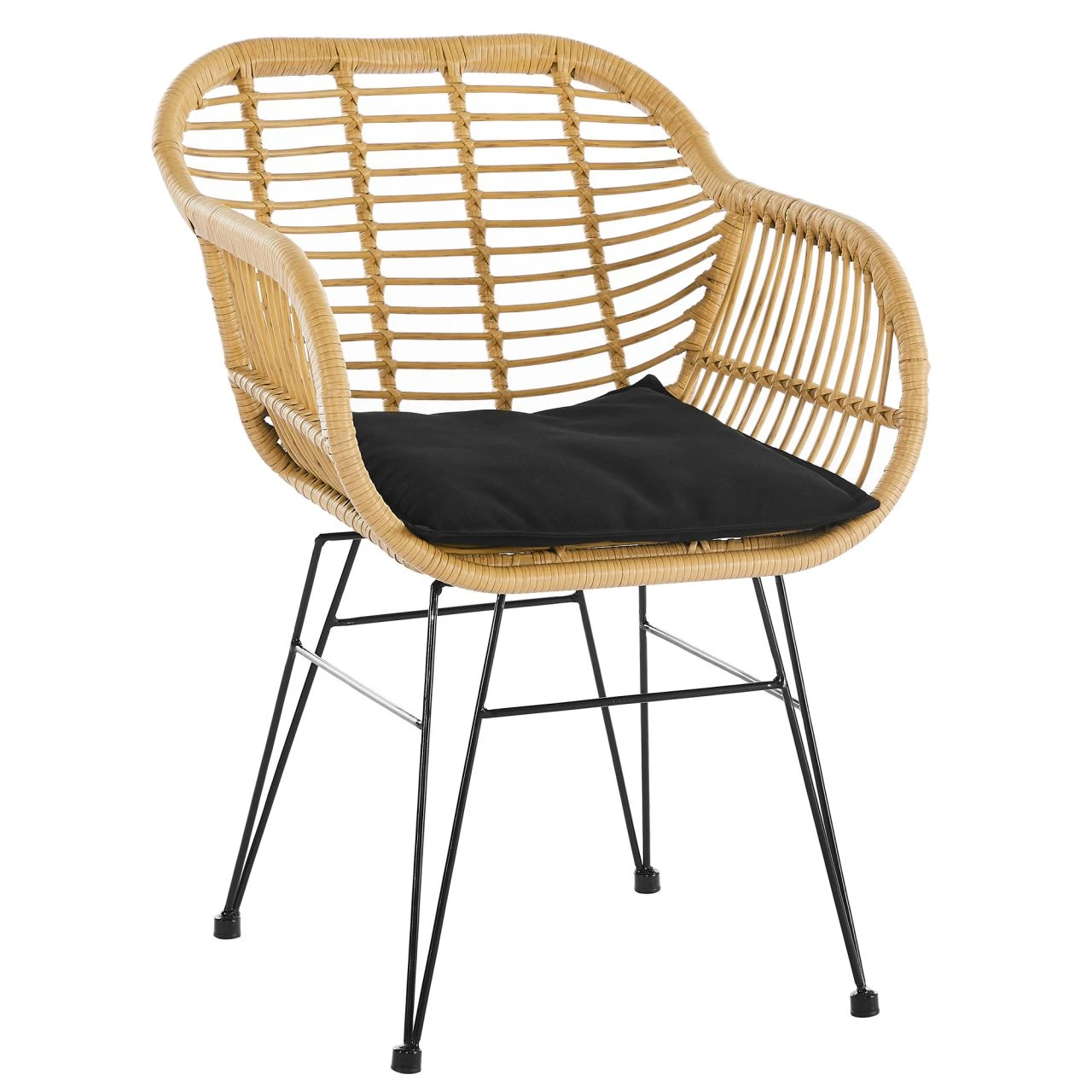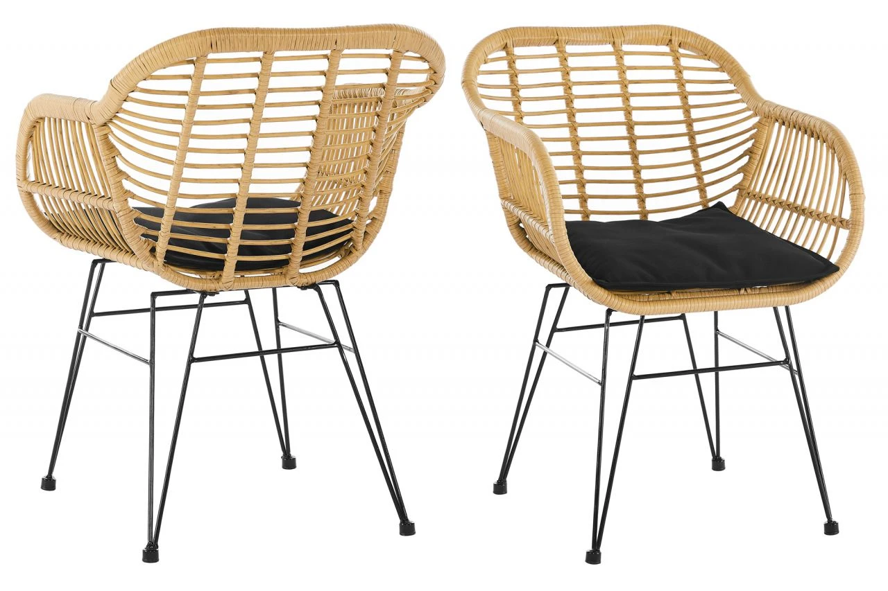 Das trendige Armlehnstuhl im 2er Set besticht durch seine Sitz- und Rückenfläche in Rattan-Optik natur und einem stabilen Metallgestell in schwarz. Diese beiden Stühle sind wetterfest und somit für den Indoor- und Outdoorbereich geeignet. Das massive Metall Gestell gewährleistet nicht nur einen stabilen Stand, sondern bietet auch einen wunderschönen Kontrast zur Rattan-Optik. Durch die bequeme Sitzschale, die aus 100% Polypropylen besteht, erhalten Sie einen angenehmen Sitzkomfort. Ein zusätzliches Sitzkissen in der Farbe schwarz rundet den Look ab. Ein Hauch Urlaubsfeeling für Ihren Wohn- oder Gartenbereich!