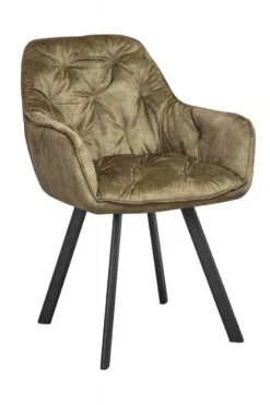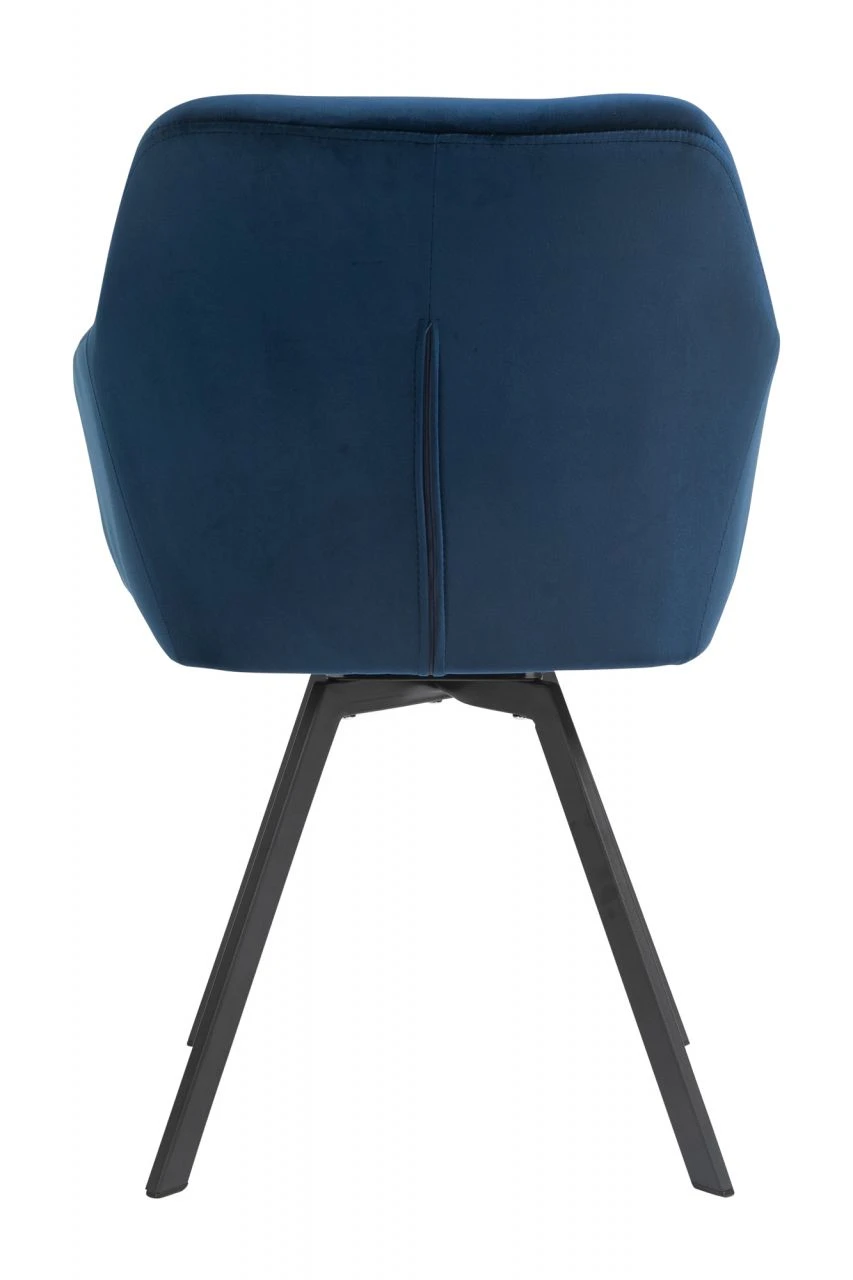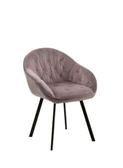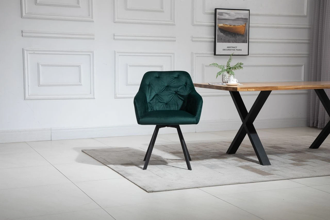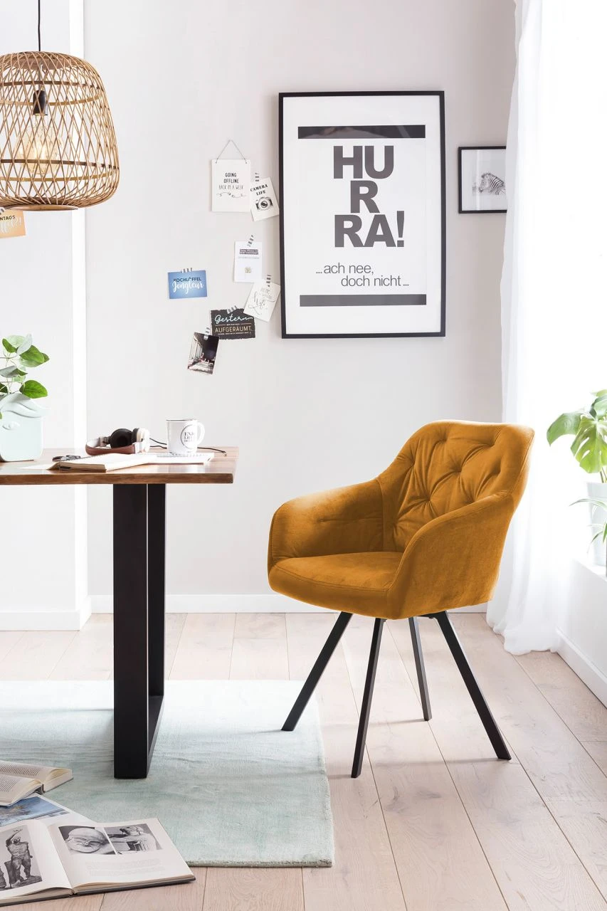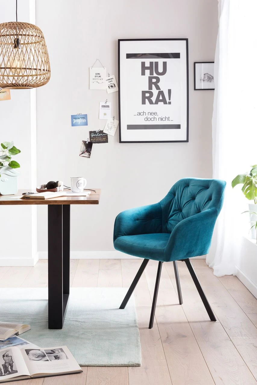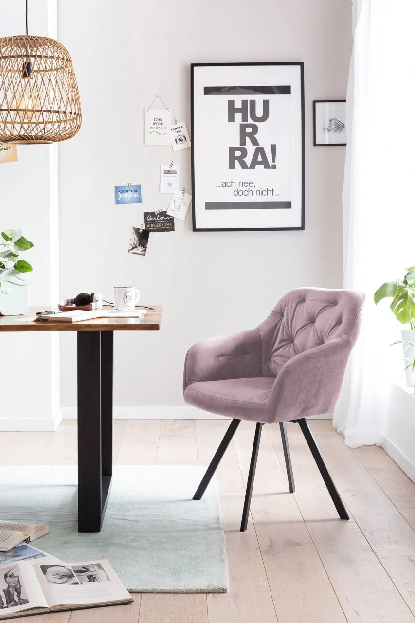 Setzt schicke Akzente – Ein besonderer Hingucker für den Essbereich ist dieser glamouröse Armlehnstuhl in Samt-Optik. Die üppige Polsterung der Sitzfläche und Armlehnen sorgt für optimalen Sitzkomfort, der hochwertige Look wird abgerundet durch die Knopfheftung im Rücken und das robuste Gestell, bestehend aus vier abgeschrägten Beinen in pulverbeschichtetem schwarzem Metall. Der Extraclou des Stuhls: Die 360° Drehfunktion, die für Bewegungsfreiheit und Komfort sorgt. Der Stuhl wird so nicht nur zur optimalen Lösung für den Esstisch, sondern macht auch am Schreib- oder Schminktisch eine gute Figur. Damit der Stuhl harmonisch in viele Wohnstile integriert werden kann, steht er in mehreren Farben zur Auswahl.