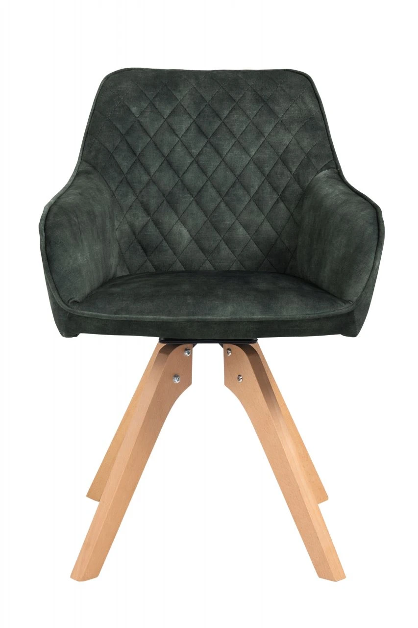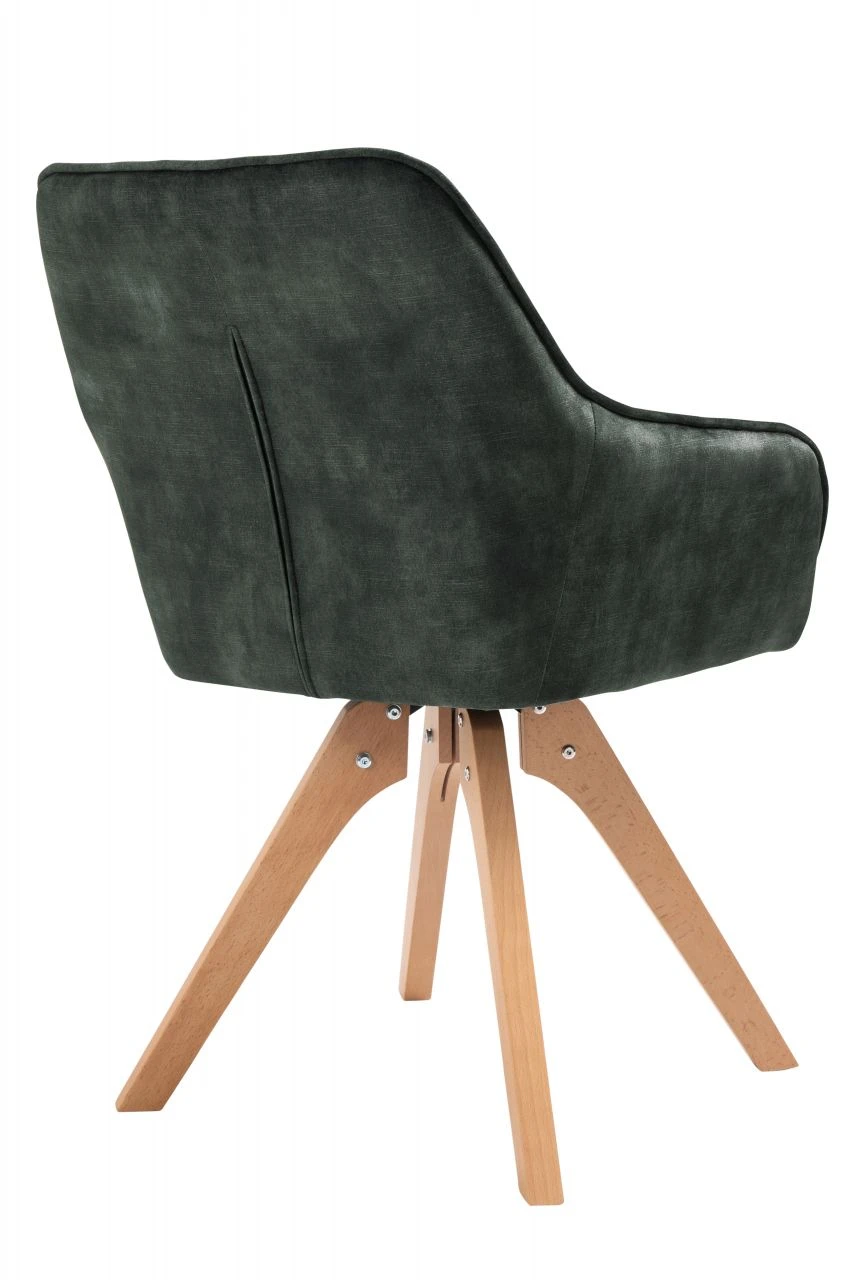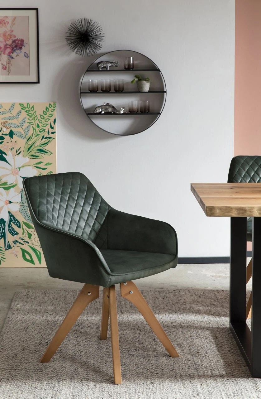 Vintage Feeling fürs Wohnzimmer! Der mondäne Samt-Stuhl passt sich perfekt Ihrem Wohninterieur an. Der hochwertige Bezug aus dunkelgrünem Samtvelours in Glanzoptik ist zeitlos elegant. Der Rücken- und Armlehnbereich ist abgerundet, wobei der Rückenbereich mit einer Diamantensteppung ausgestattet ist – ein echter Eyecatcher. Das Design-Gestell der naturfarbenen Beine aus massiver Buche sorgt für einen festen Stand und hohen Sitzkomfort. Besonderes Highlight ist dabei die 180 Grad Drehplatte unter der Sitzfläche. Dieser Stuhl ist für jedes Ess- und Wohnzimmer eine Bereicherung und wertet Ihre Räumlichkeiten optisch auf. Der Sitzkomfort ist unbeschreiblich!
