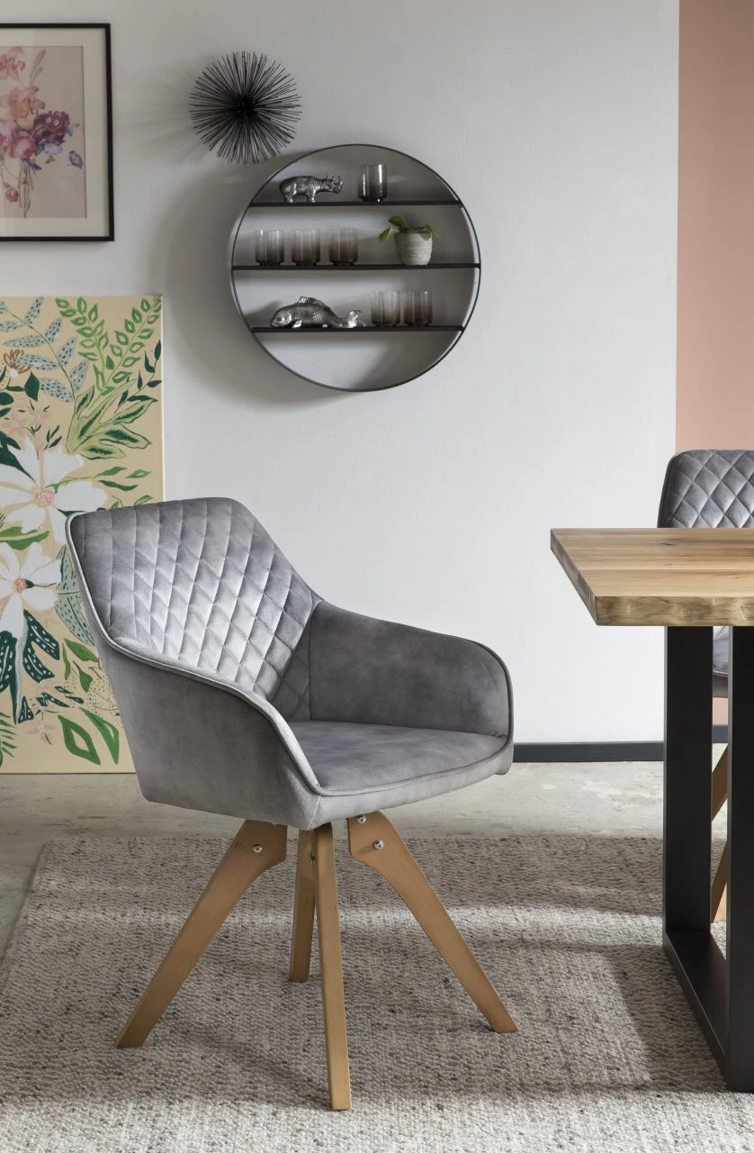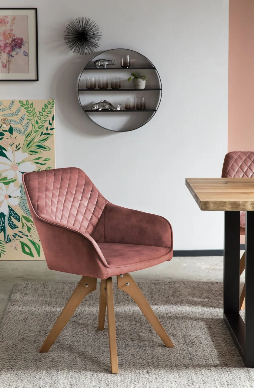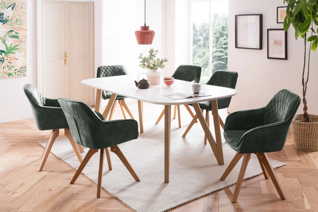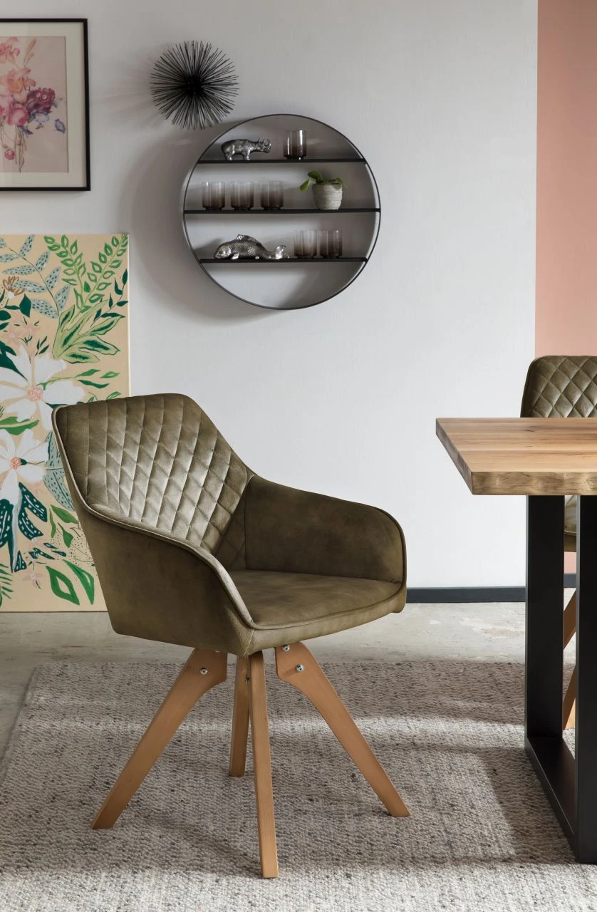 Vintage Feeling fürs Wohnzimmer! Der mondäne Samt-Stuhl passt sich perfekt Ihrem Wohninterieur an. Der hochwertige Bezug aus dunkelgrünem Samtvelours in Glanzoptik ist zeitlos elegant. Der Rücken- und Armlehnbereich ist abgerundet, wobei der Rückenbereich mit einer Diamantensteppung ausgestattet ist – ein echter Eyecatcher. Das Design-Gestell der naturfarbenen Beine aus massiver Buche sorgt für einen festen Stand und hohen Sitzkomfort. Besonderes Highlight ist dabei die 180 Grad Drehplatte unter der Sitzfläche. Dieser Stuhl ist für jedes Ess- und Wohnzimmer eine Bereicherung und wertet Ihre Räumlichkeiten optisch auf. Der Sitzkomfort ist unbeschreiblich!