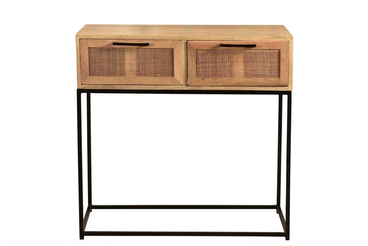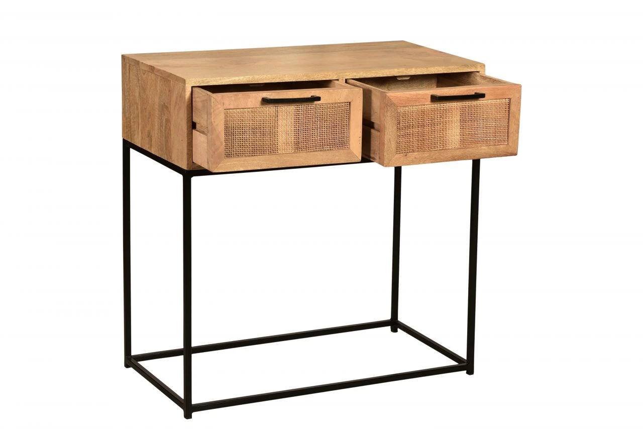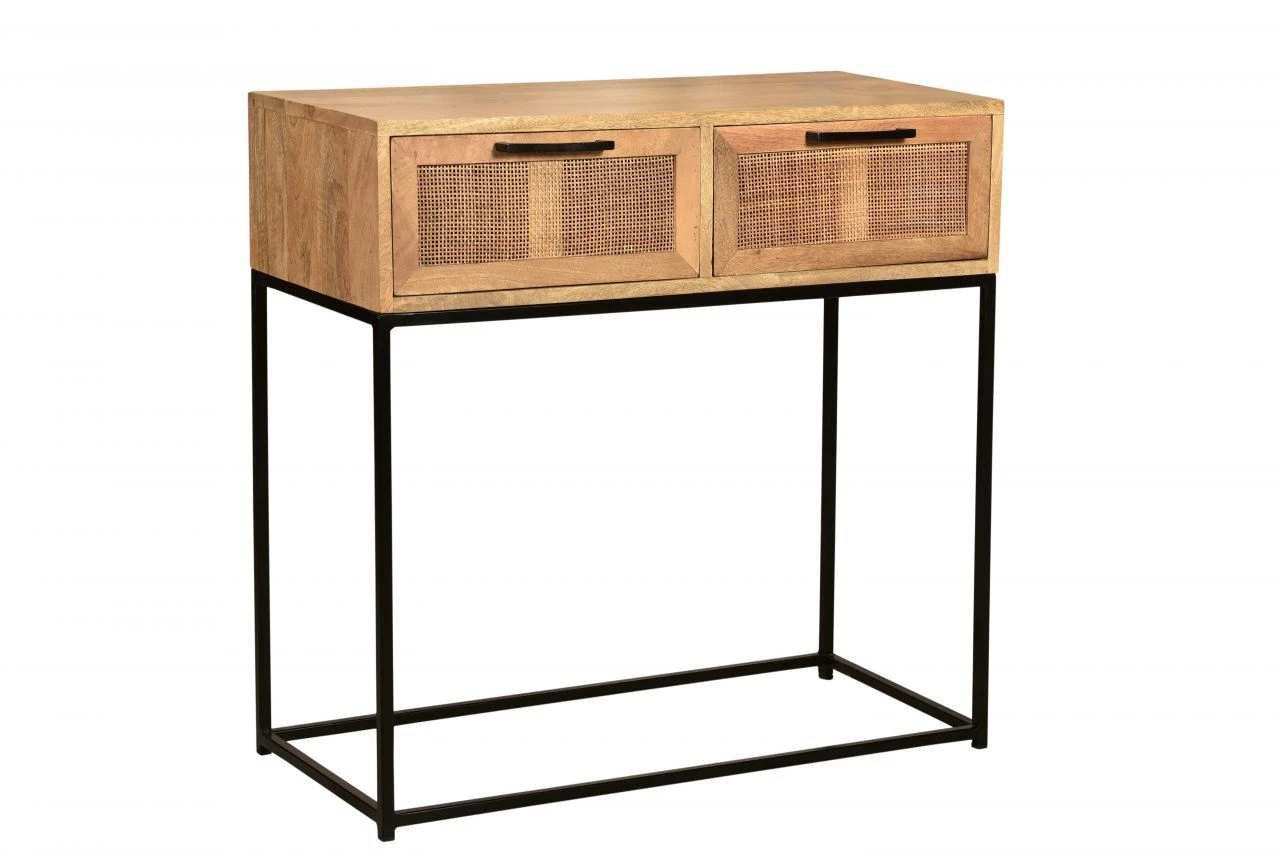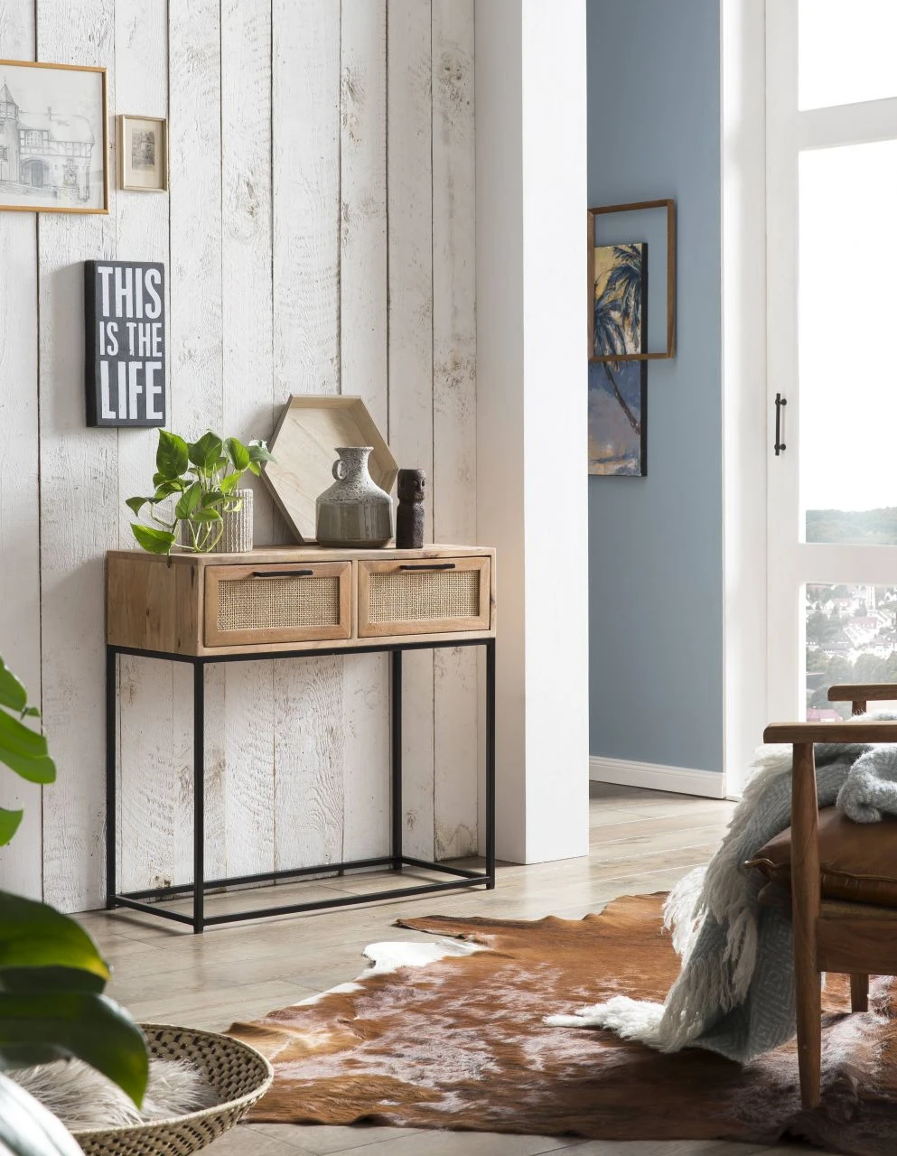 Dieser Konsolentisch aus naturfarbigem Mangoholz mit luftiger Rattan-Front auf den Schubladen und einem Kufengestell aus schwarzem Metall ist ein wahrer Eyecatcher. Das Ablagetischchen ist dank seiner Kombinationsmöglichkeit mit schon vorhandenem Mobiliar vielseitig einsetzbar, so ist es gerade für den angesagten Industrial Look wie gemacht, aber auch mit Landhausmöbeln oder skandinavischem Design lässt es sich problemlos kombinieren. Der Konsolentisch bietet in zwei Schubladen viel Platz für persönliche Dinge. Er ist durch seine geringe Tiefe auch in kleinen Räumen einsetzbar und sorgt mit seinem modernen Materialmix für eine wohnliche Atmosphäre.