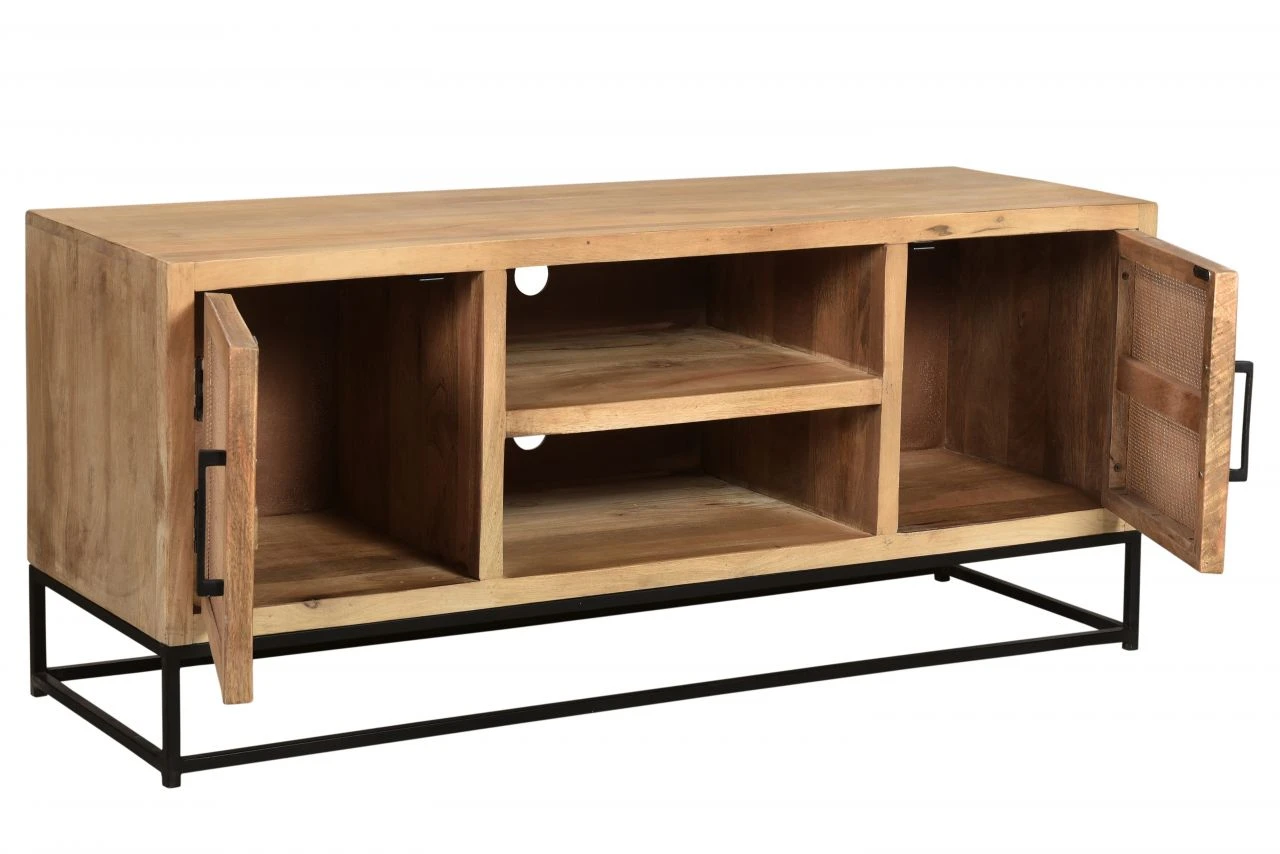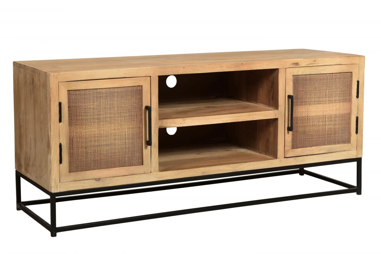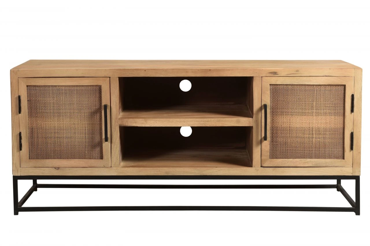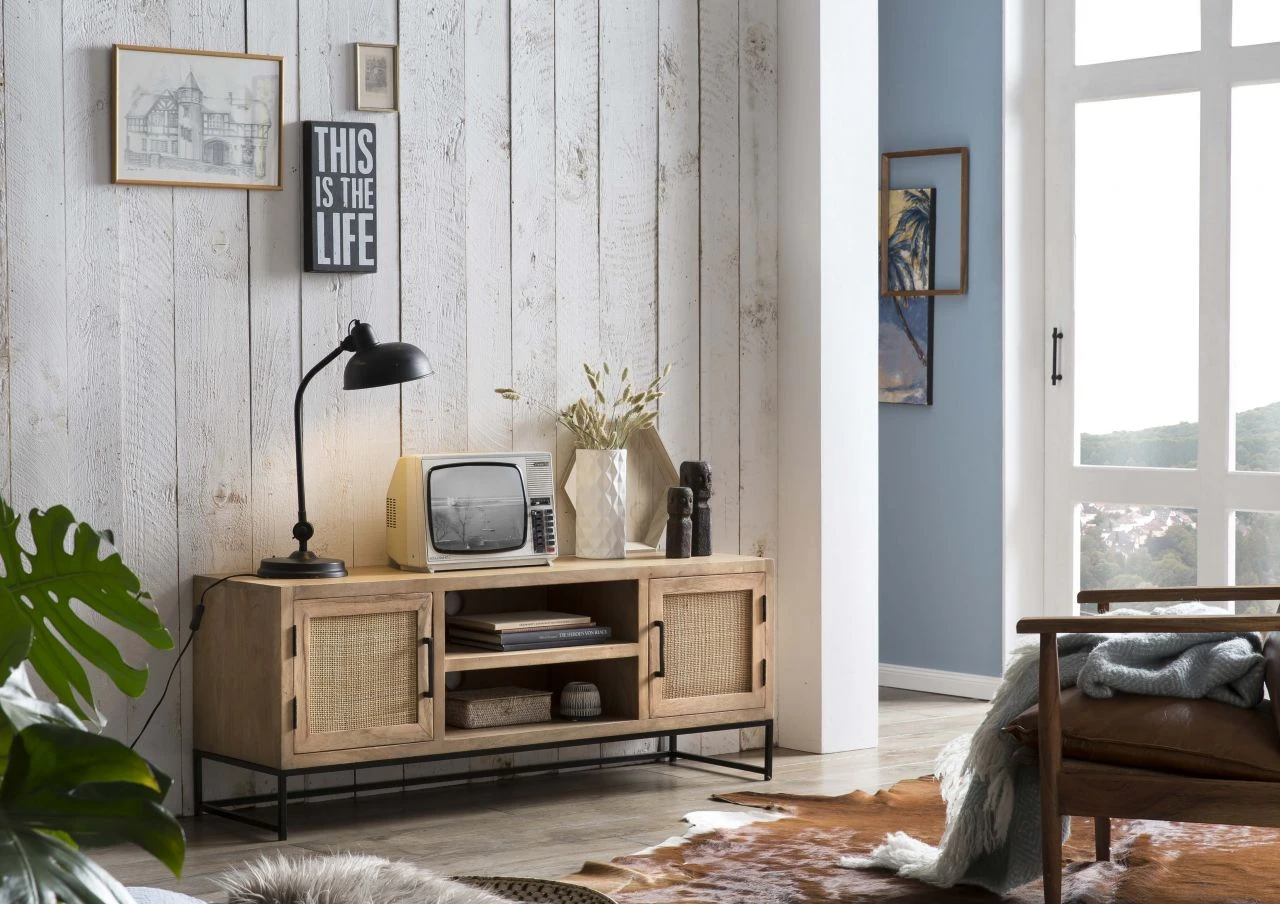 Dieses Lowboard aus naturfarbigem Mangoholz mit luftiger Rattan-Front auf den Türen und einem Kufengestell aus schwarzem Metall ist ein wahrer Eyecatcher. Die TV-Bank ist dank ihrer Kombinationsmöglichkeit mit schon vorhandenem Mobiliar vielseitig einsetzbar, so ist sie gerade für den angesagten Industrial Look wie gemacht, aber auch mit Landhausmöbeln oder skandinavischem Design lässt sie sich problemlos kombinieren. Das Lowboard bietet mit zwei offenen Fächern Platz für Ihre HiFi-Geräte, hinter zwei Türen befinden sich weitere Fächer, die noch mehr Stauraum bieten. Es sorgt mit seinem modernen Materialmix für eine wohnliche Atmosphäre in Ihrem Zuhause.
