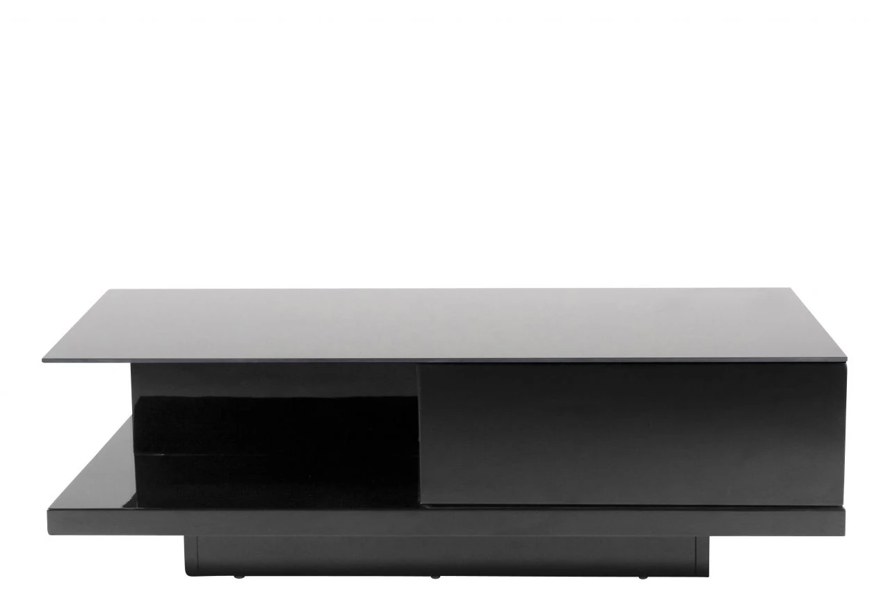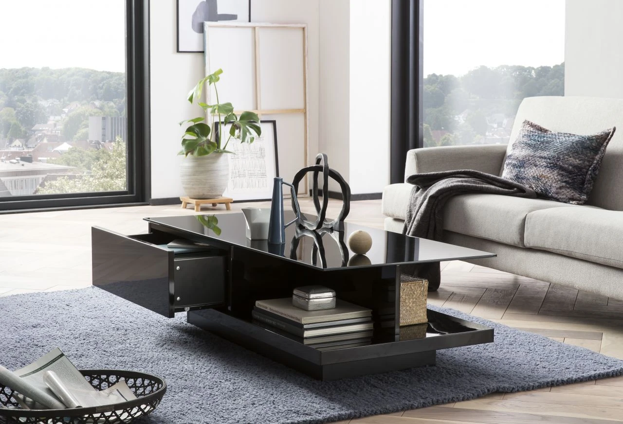 Dieser moderne Couchtisch fällt durch seine eleganten Akzente sofort ins Auge. Der komplette Sofatisch wurde aus MDF Holz hergestellt und in Hochglanz schwarz lackiert. Die gehärtete Kristallglas Tischplatte ist 8 mm dick und von unten schwarz lackiert. Für viel Stauraum sorgen zwei Schubladen, die gegenüberliegend sind, sowie zwei offene Fächer. Hier sind genügend Stau- und Ablagemöglichkeiten für Getränke, Snacks, Zeitschriften oder ähnliches. Dieser Wohnzimmertisch passt sehr gut in bereits vorhandenes Interior. Besonders auffällige Kontraste können durch helle oder dunkle Möbelfarben geschaffen werden, wie z.B. den modischen schwarz-weiß Kontrasten.