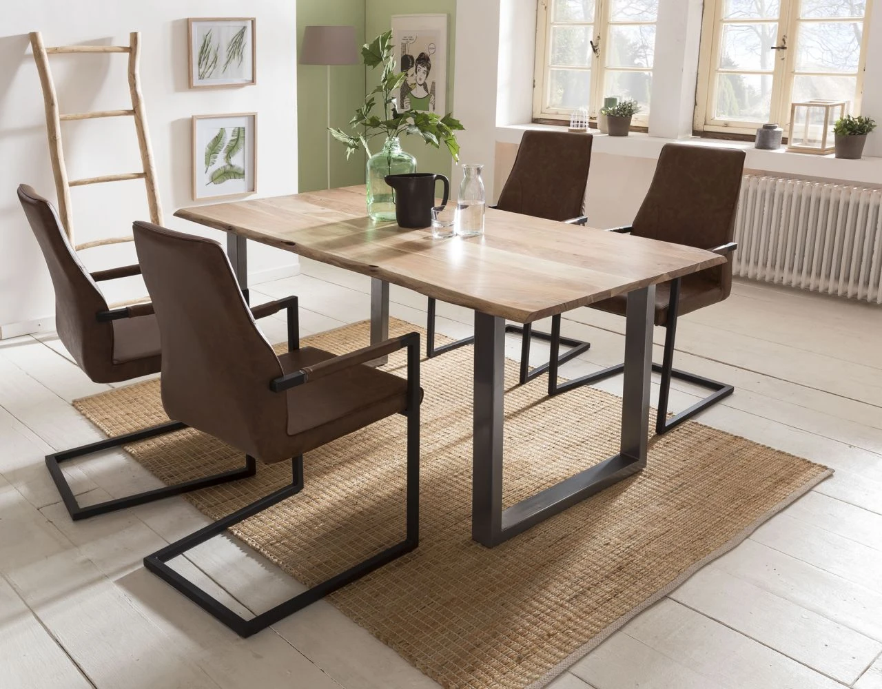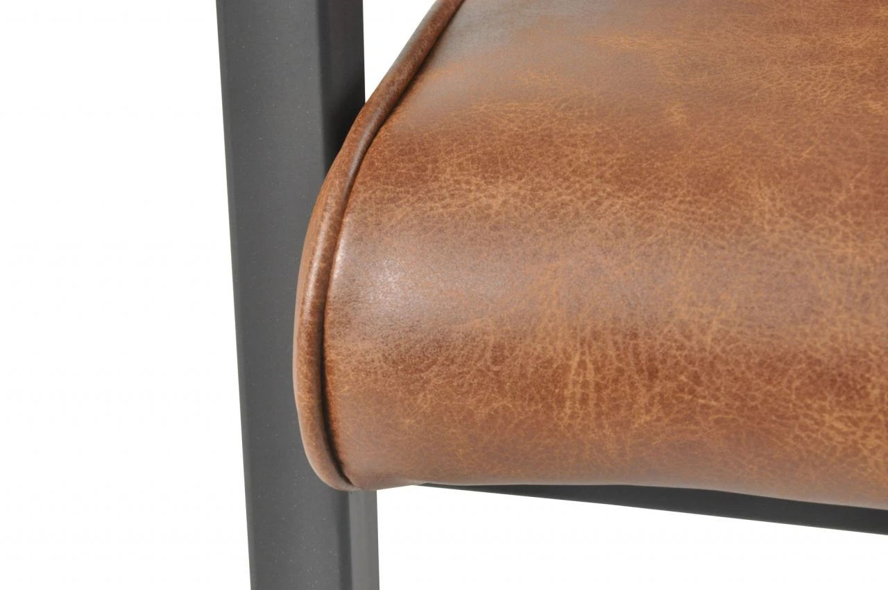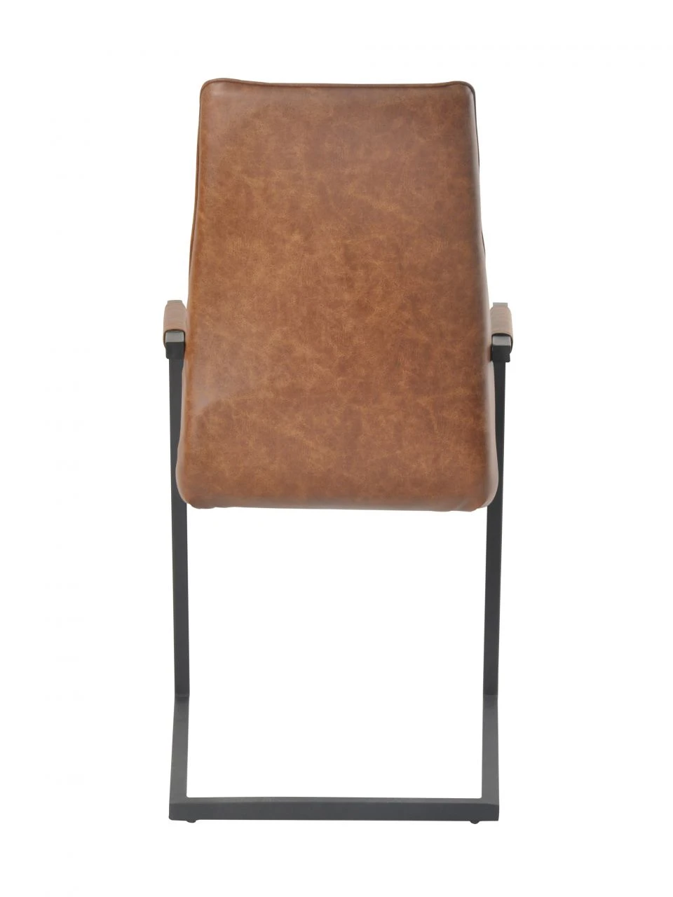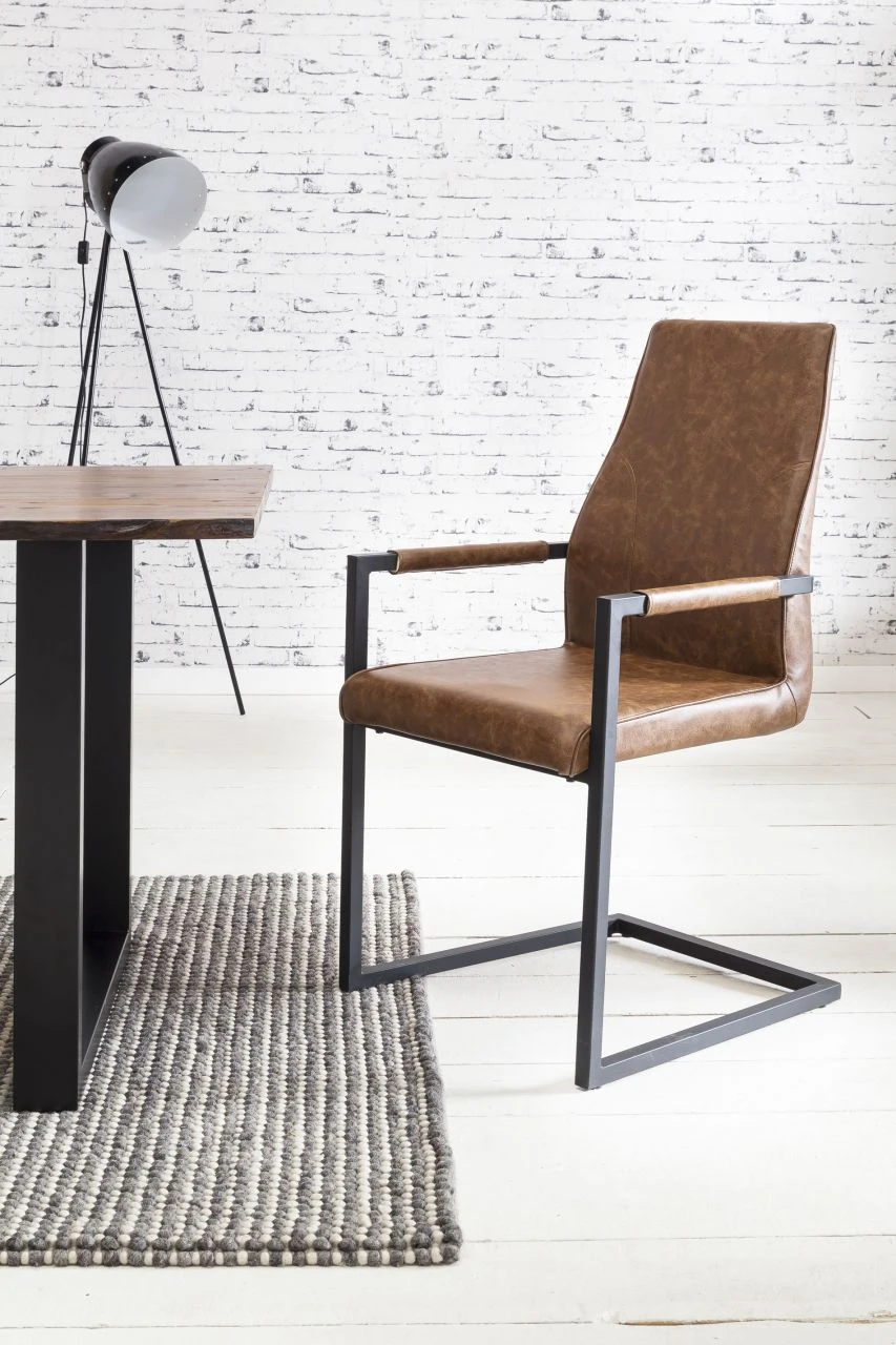 Schönes und stilvolles Freischwinger 2er-Set im industriellen Design. Die Armlehnen, sowie Sitz- und Rückenfläche sind mit einem hochwertigen Bezug in Leder-Optik bezogen. Das Schwinggestell aus schwarz lackiertem Metall gewährleistet nicht nur einen sicheren Stand, sondern bietet auch einen großartigen Kontrast zum Bezug des Stuhles. Die Armlehnen und die Rückenlehne sind leicht nach außen gebogen. Durch die bequeme Polsterung, die hohen Armlehnen und die hohe Rückenlehne können Sie hier richtig entspannen und es entsteht ein angenehmer Sitzkomfort der Extraklasse.