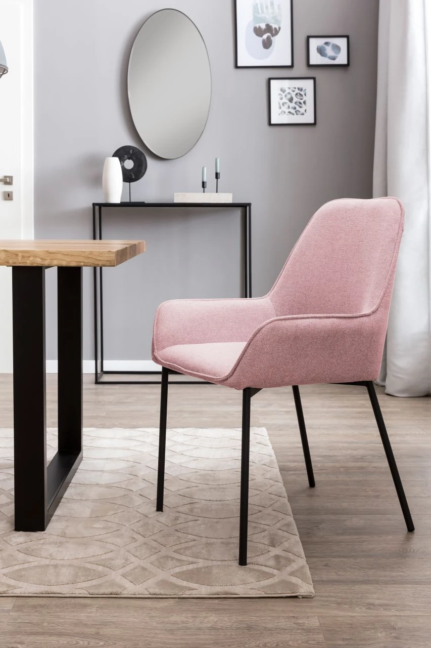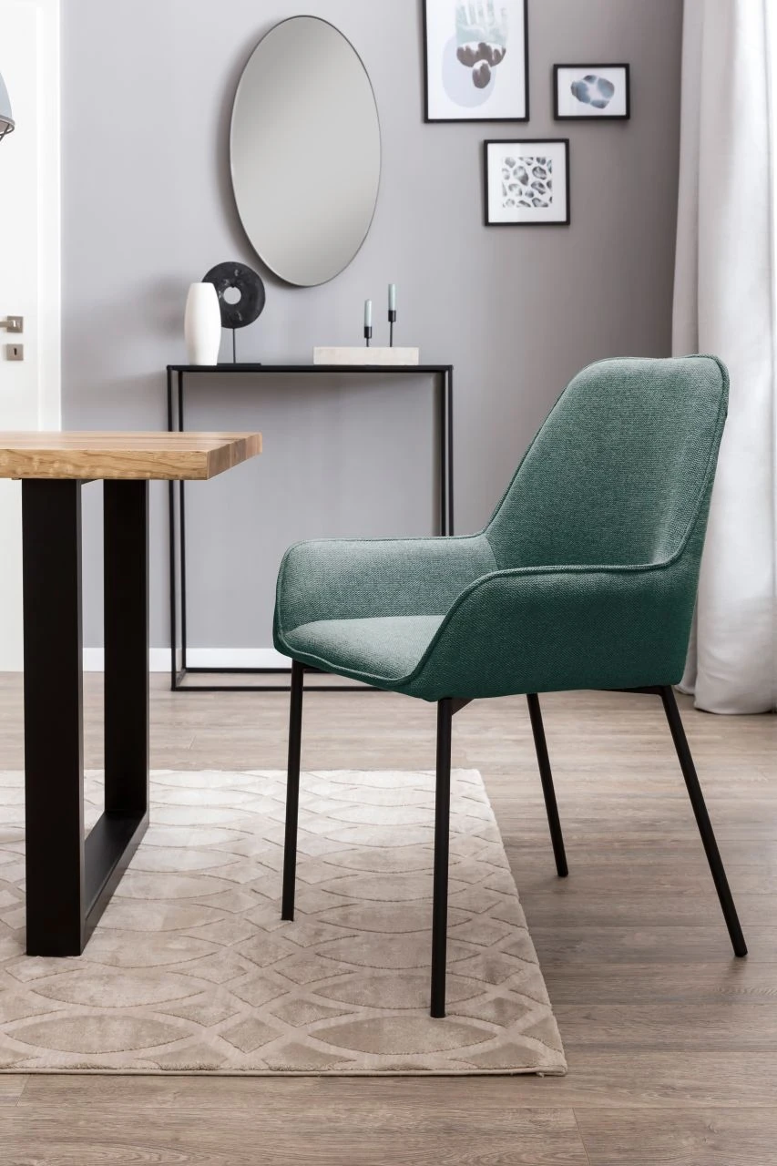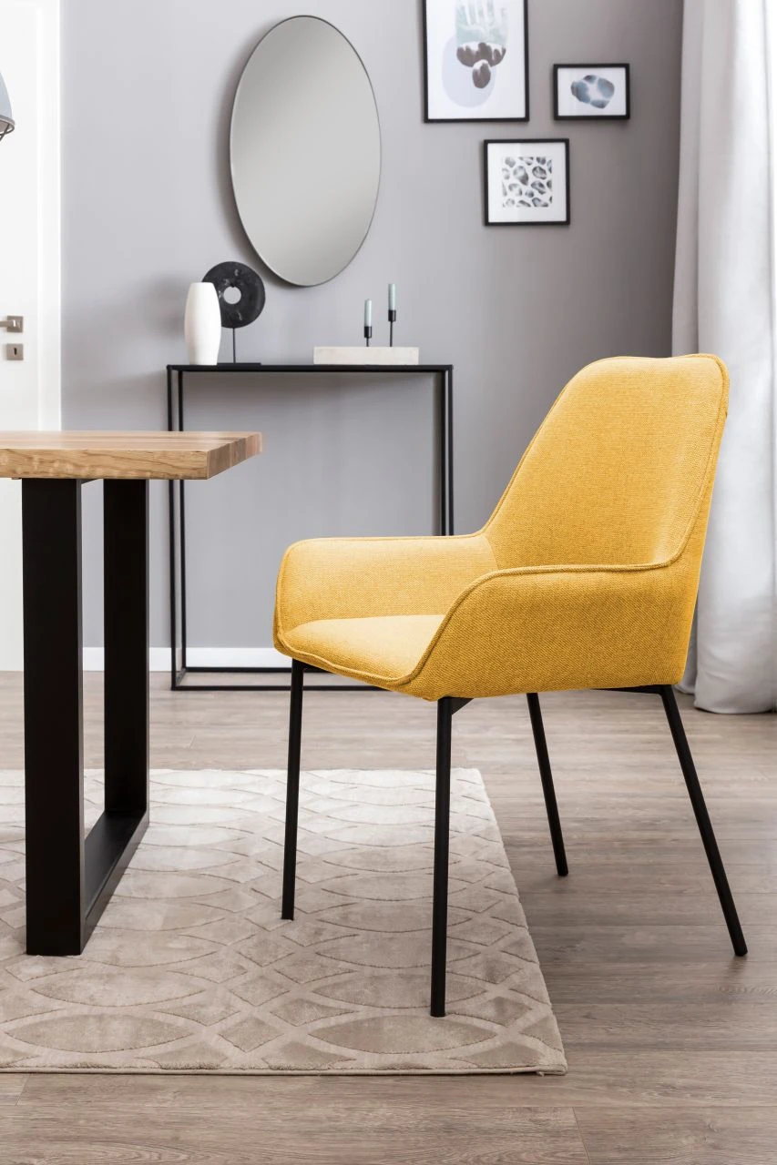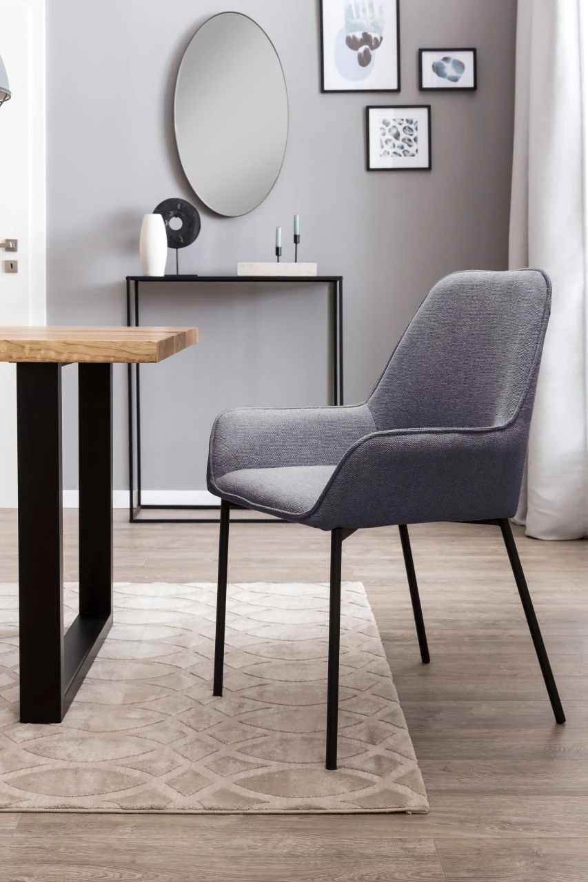 Der moderne Polsterstuhl im 2er Set besticht durch seinen Bezug aus groben Strukturstoff und überzeugt mit seiner Polsterung an Sitz- und Rückenfläche. Das leicht ausgestellte 4 Fuß Gestell ist aus Metall in schwarz matt und gewährleistet nicht nur einen sicheren Stand, sondern bietet auch einen großartigen Kontrast zum Bezug des Stuhles. Durch die bequeme Polsterung, die Rückenlehne und die Armlehnen entsteht ein angenehmer Sitzkomfort der Extraklasse. Der Stoffbezug des Armlehnstuhls ist sehr pflegeleicht und strapazierfähig. Kleinere Verschmutzungen mit etwas Wasser und Neutralseife reinigen. Die Stuhlbeine können mit einem trockenen Baumwolltuch, aber auch leicht feucht, abgewischt werden.