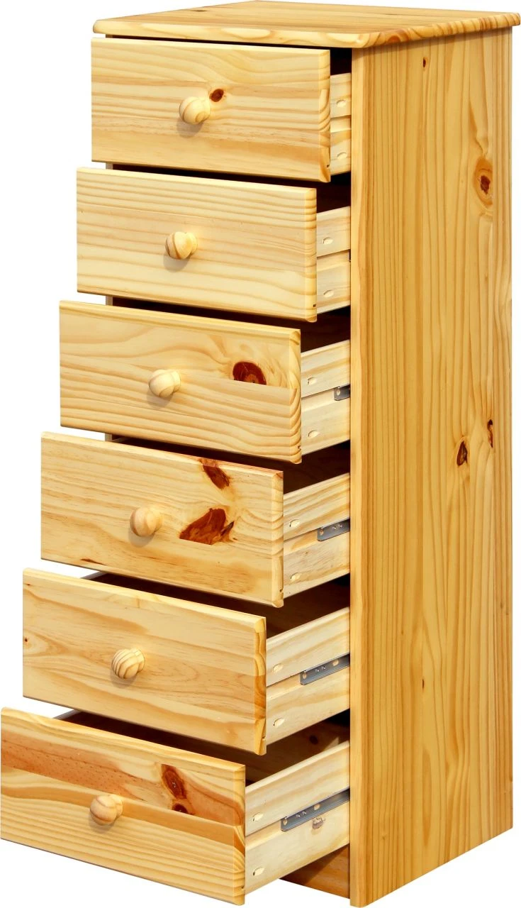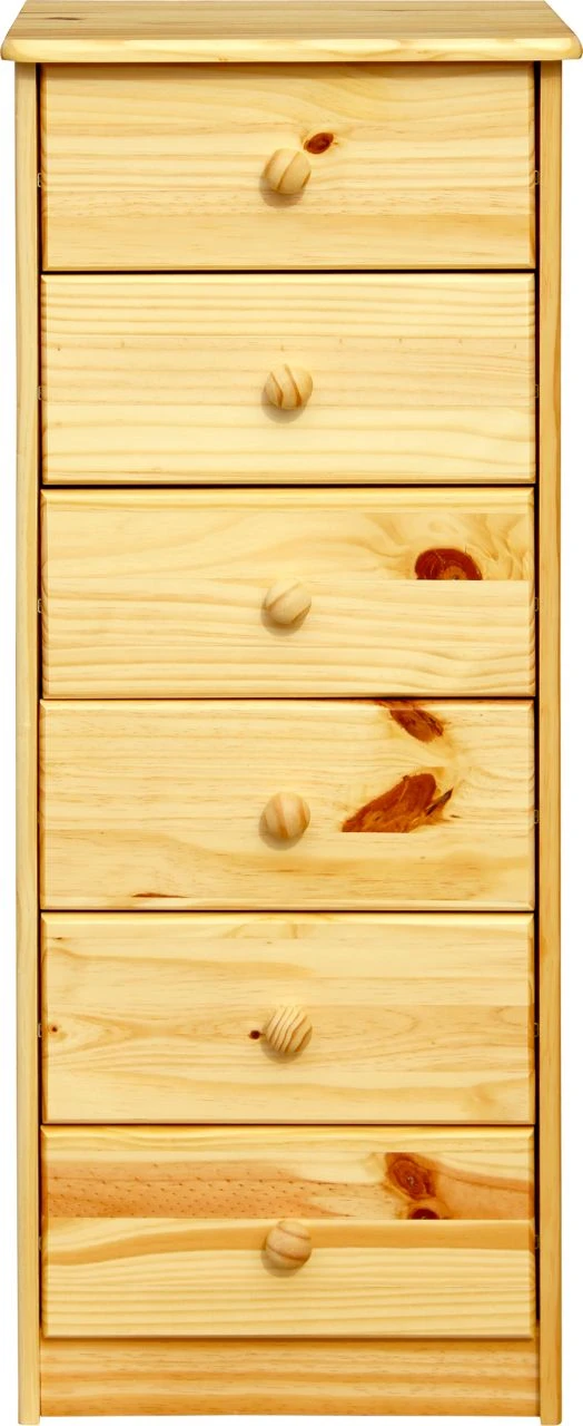 Diese solide und hochwertige Kommode ist aus massivem Kiefernholz gefertigt und die Oberflächen sind zum Schutz lackiert. Viel Stauraum und Platz für Wäsche befindet sich in 6 Schubladen mit Metallauszug. Ein sehr funktionales Möbelstück, das nicht nur pflegeleicht, sondern auch vielseitig verwendbar ist – ideal zum Beispiel für ein Studentenzimmer oder kleine Räume.
