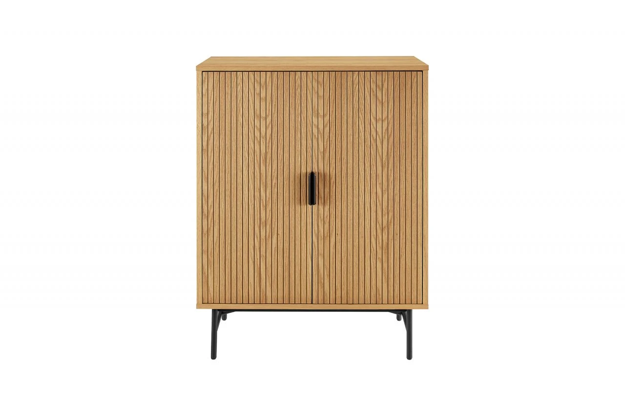 Helles Eiche Echtholzfurnier und hohe, schwarz lackierte Füße sorgen nicht nur für moderne Kontraste, sondern bringen auch den angesagten Scandi Style ins Eigenheim. Die kratzfeste PU-Lackierung auf dem Korpus des Möbels macht dieses besonders widerstandsfähig und langlebig, so dass Sie lange Freude an Ihrem Möbelstück haben. Das Gestell mit den filigranen Beinen sorgt für luftig-leichte Optik und einen modernen Loft-Charakter. Die Paneel-Optik des Eichenfurniers sorgt optisch für das gewisse Etwas. In dieser Kommode bieten 2 Türen mit 4 Regalböden geschlossenen Stauraum – für spielend leicht mehr Ordnung im Wohnbereich.