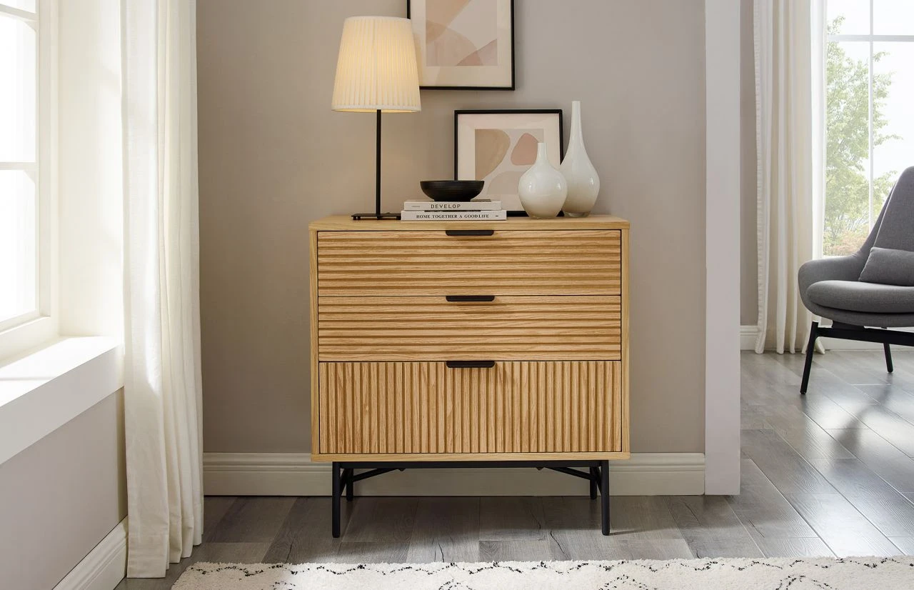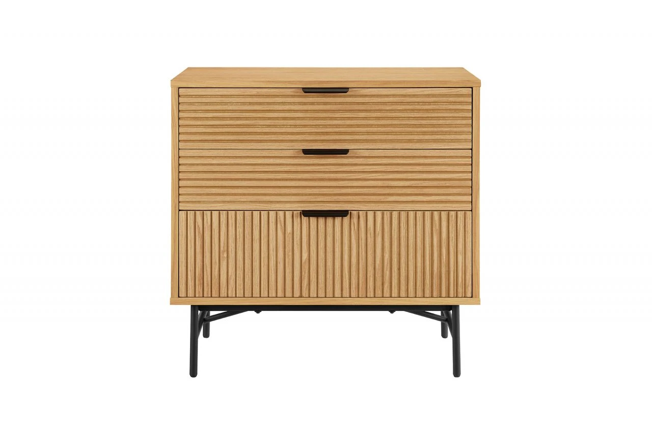 Helles Eiche Echtholzfurnier und hohe, schwarz lackierte Füße sorgen nicht nur für moderne Kontraste, sondern bringen auch den angesagten Scandi Style ins Eigenheim. Die kratzfeste PU-Lackierung auf dem Korpus des Möbels macht dieses besonders widerstandsfähig und langlebig, so dass Sie lange Freude an Ihrem Möbelstück haben. Das Gestell mit den filigranen Beinen sorgt für luftig-leichte Optik und einen modernen Loft-Charakter. Die Paneel-Optik des Eichenfurniers sorgt optisch für das gewisse Etwas. In dieser Kommode bieten 3 Schubladen geschlossenen Stauraum – für spielend leicht mehr Ordnung im Wohnbereich.