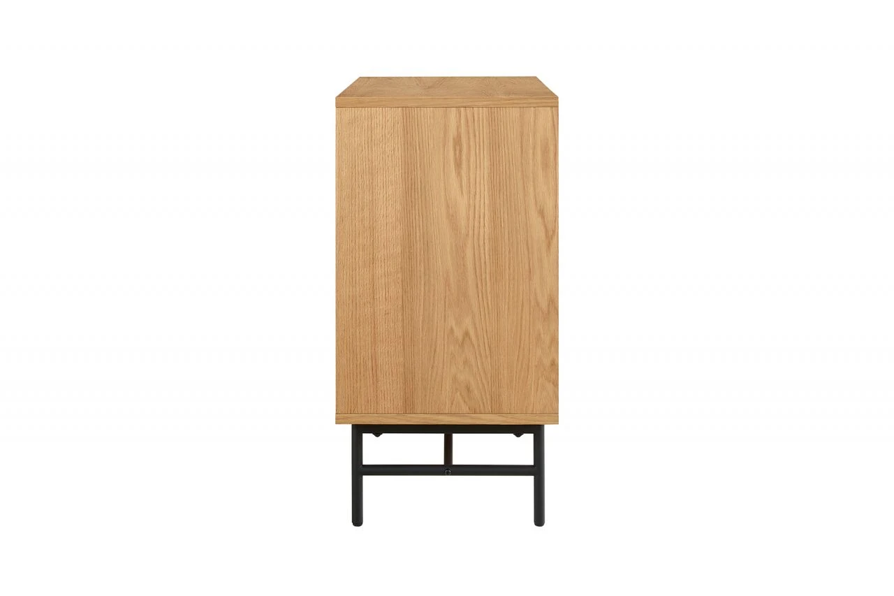 - Front: MDF (Mitteldichte Holzfaserplatte), furniert (Holzart: Eiche), Rückwand: Melamine Eichefarben, Gestell: Metall pulverbeschichtet Schwarz, Korpus mit kratzfester PU-Lackierung.