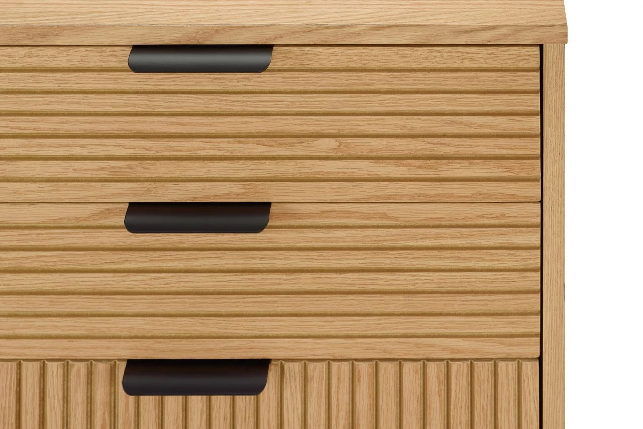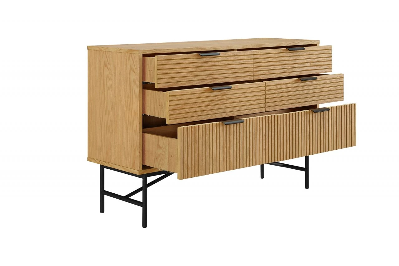 Helles Eiche Echtholzfurnier und hohe, schwarz lackierte Füße sorgen nicht nur für moderne Kontraste, sondern bringen auch den angesagten Scandi Style ins Eigenheim. Die kratzfeste PU-Lackierung auf dem Korpus des Möbels macht dieses besonders widerstandsfähig und langlebig, so dass Sie lange Freude an Ihrem Möbelstück haben. Das Gestell mit den filigranen Beinen sorgt für luftig-leichte Optik und einen modernen Loft-Charakter. Die Paneel-Optik des Eichenfurniers sorgt optisch für das gewisse Etwas. In dieser Kommode bieten 6 Schubladen geschlossenen Stauraum – für spielend leicht mehr Ordnung im Wohnbereich.