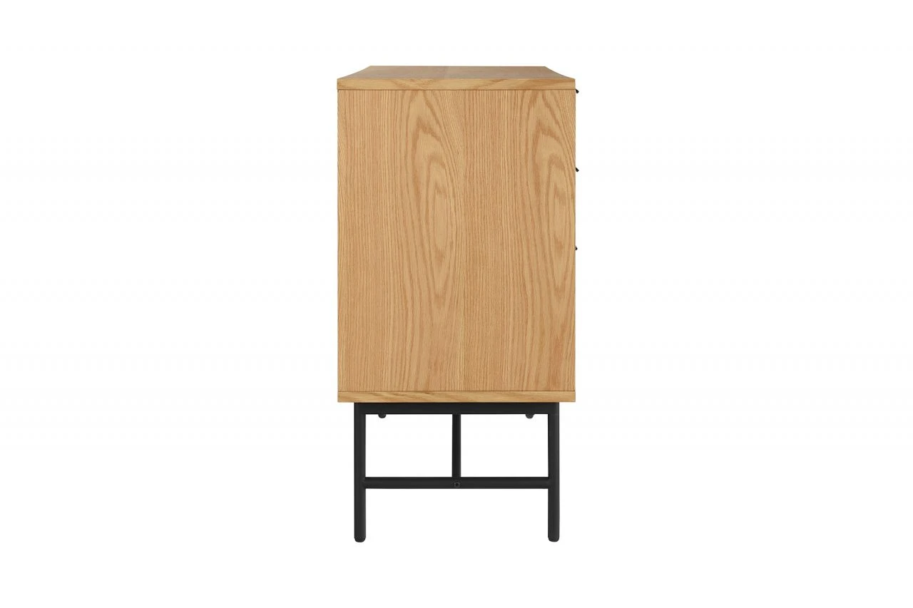 - Front: MDF (Mitteldichte Holzfaserplatte), furniert (Holzart: Eiche), Rückwand: Melamine Eichefarben, Gestell: Metall pulverbeschichtet Schwarz, Korpus mit kratzfester PU-Lackierung.