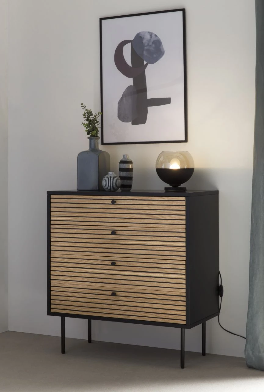 Skandinavischer Stil modern interpretiert! Die Kommode bietet Ihnen schlichte nordische Eleganz. Die Kombination zwischen dem schwarzen Korpus aus MDF-Holz mit Melaminbeschichtung und dem Eiche Echtholzfurnier bildet einen großartigen Kontrast. Die MDF-Holz Front ist mit Eiche Echtholzfurnier ausgestattet und ist somit ein echter Blickfang. Hinter 4 Schubladen bietet sich genügend geschlossener Stauraum für die verschiedensten Sachen. Auf der Deckplatte finden Blumen oder Dekoration ihren Platz. Egal ob in Ihrem Wohnzimmer oder in Ihrem Schlafzimmer – mit dem Sideboard stehen Ihnen alle Möglichkeiten offen!