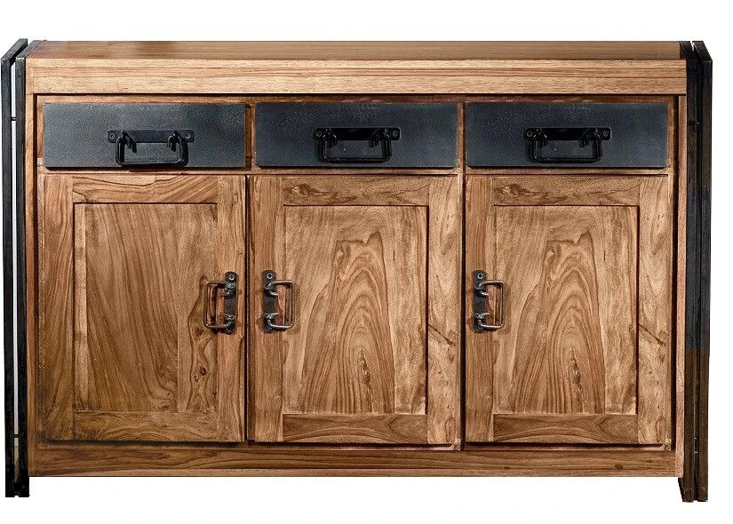 Ein attraktiver Blickfang in Ess- oder Wohnzimmer ist dieses Sideboard aus Akazien-Holz. Es punktet mit einem Mix aus Holz in warmem Naturton und Metallgriffen. Der Materialmix von warmem Holz und derben Metall liegt voll im Trend und sorgt für interessante Kontraste in der Optik. Neben seiner Optik überzeugt diese Kommode mit fühlbarer Struktur. Das Sideboard lässt sich harmonisch in verschiedene Wohnprogramme integrieren. Hinter drei Türen und drei Schubladen verbirgt sich jede Menge geschlossener Stauraum, in dem Alltagsgegenstände, die man gerne verstecken möchte, Platz finden. Sorgt für eine wohnliche Atmosphäre: das Sideboard mit modernem Materialmix. Jedes Stück ein Unikat.