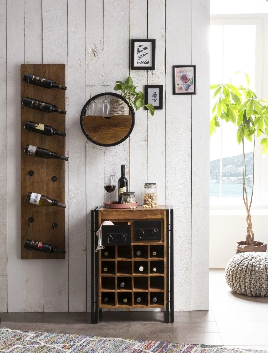 Mit diesem praktischen Weinregal können Sie 8 Weinflaschen gleichzeitig platzsparend und dekorativ an der Wand unterbringen. Die Kombination von mehreren Wandregalen erhöht die Kapazität und setzt der kreativen und individuellen Anordnung keine Grenzen. Das warme Akazienholz und die antikschwarzen Metallhaken in Kombination mit edlen Weinflaschen zaubern ein stilvolles und gemütliches Flair.