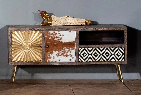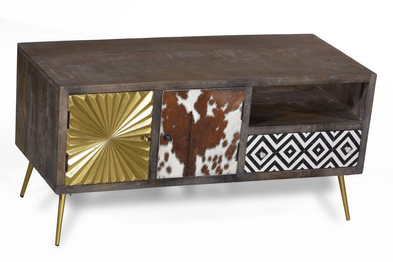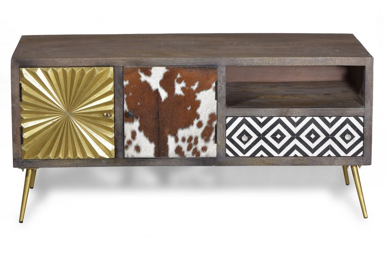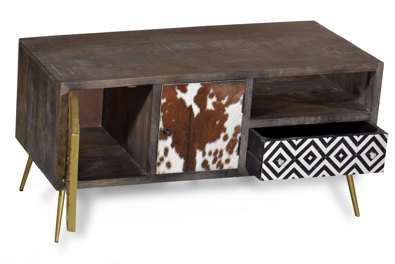 Messing, Leder, Intarsien, Kuhfell und recyceltes Altholz – das sind die handwerklich verarbeiteten Materialien dieses Lowboards mit 2 Türen, einer Schublade und einem offenen Fach. Ob als Masterpiece oder Eyecatcher, dieses Möbel sticht aus der Masse hervor. Es setzt Akzente wo vorher Langeweile drohte.