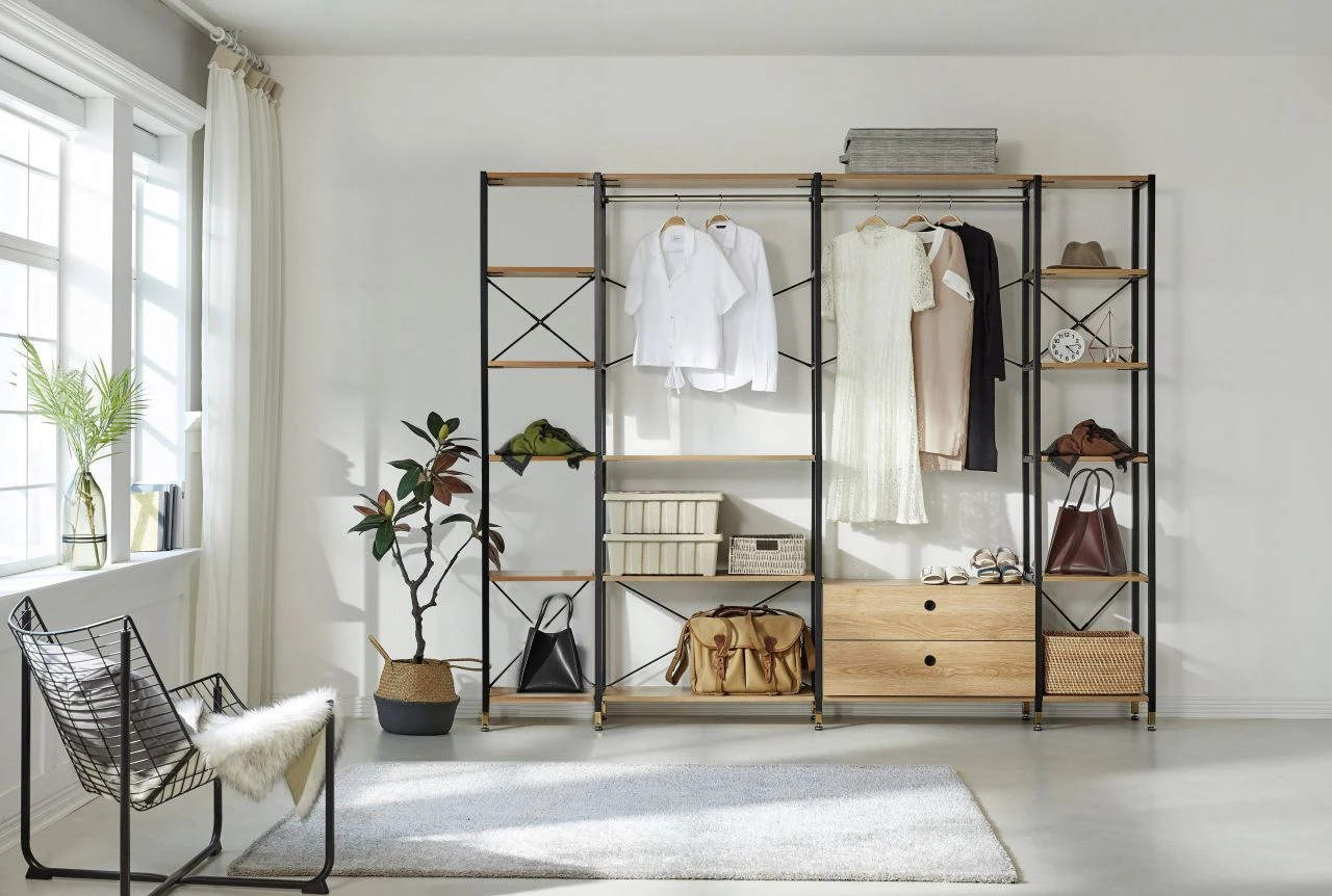 - 2 breite Regale, 2 schmale Regale, 2 Schubladen und 2 Kleiderstangen