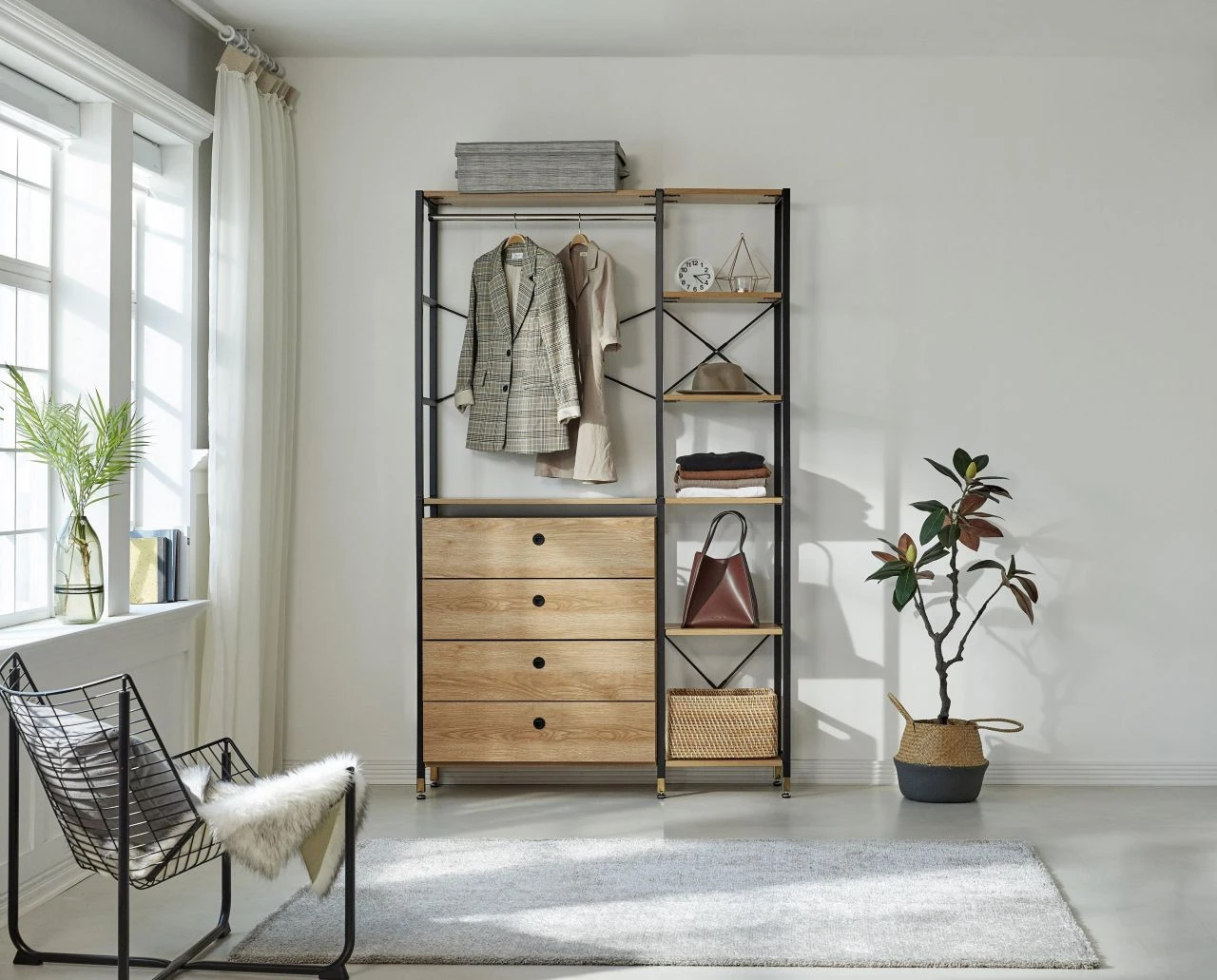 - 1 breites Regal, 1 schmales Regal, 4 Schubladen und 1 Kleiderstange