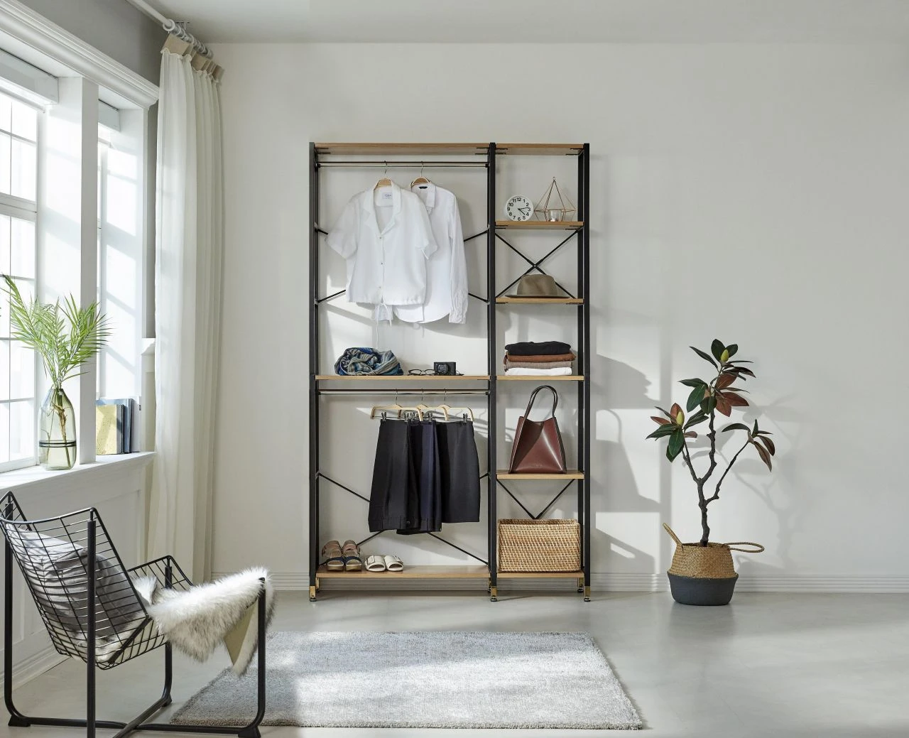 Jetzt kommt Ordnung ins Chaos. Mit diesem Regal-Set schaffen Sie zusätzlichen Stauraum und Platzmangel ist künftig kein Thema mehr. Mit einer Höhe von 210 cm bietet Ihnen das Wand-Regal Set genügend Platz für z.B. Bücher, Kleidungsstücke oder Dekorationsartikel. Die zwei Kleiderstangen ermöglichen es Ihnen Jacken, Mäntel oder Blusen aufzuhängen. Auf den Regalböden findet sich Platz für Dinge des alltäglichen Lebens, Taschen oder Wäsche. Während das robuste Gestell aus Metall besteht, sind die Einlegeböden aus MDF mit Akazie-Dekor. Dank der offenen Aufteilung des Standregals kann dieses auch als Raumteiler genutzt werden.