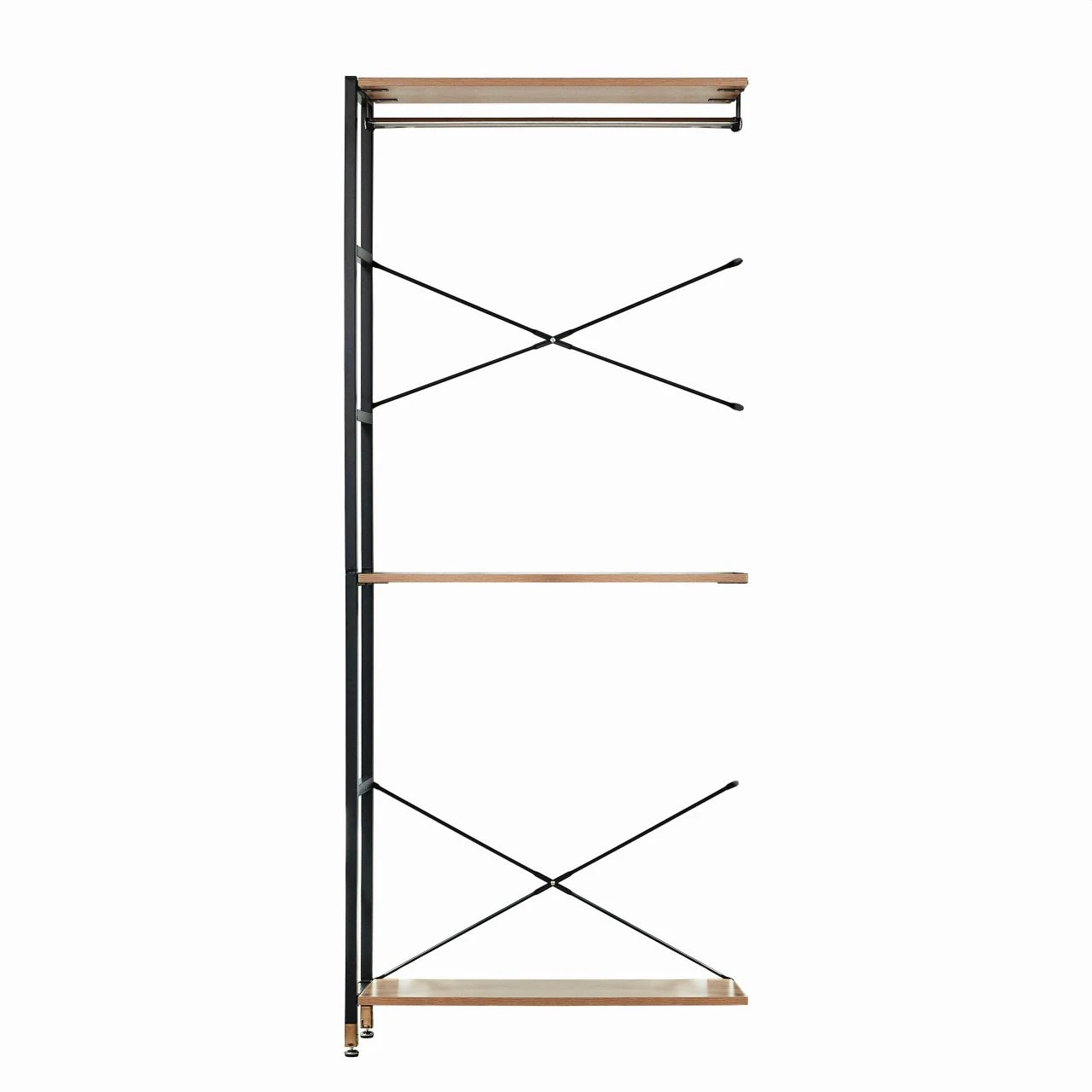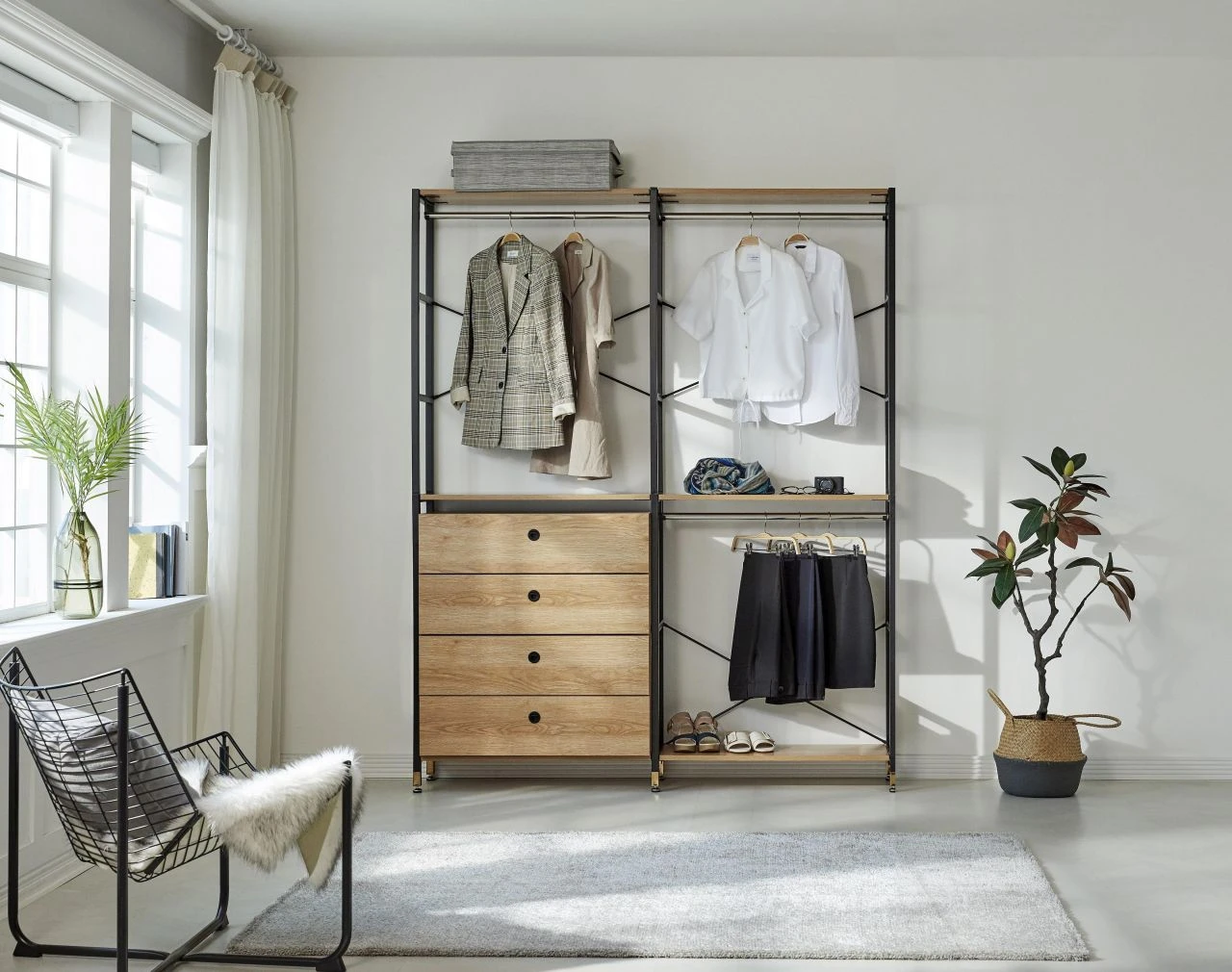 - 2 breite Regale, 4 Schubladen und 3 Kleiderstangen