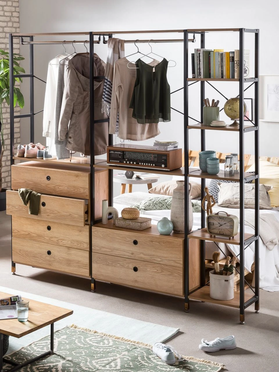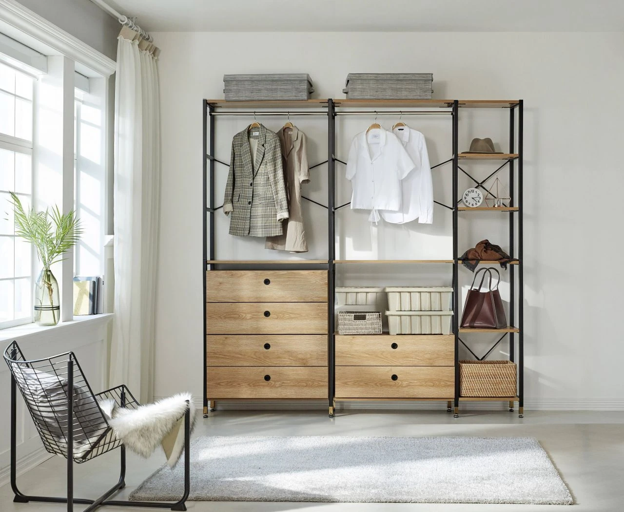 - 2 breite Regale, 1 schmales Regal, 6 Schubladen und 2 Kleiderstangen