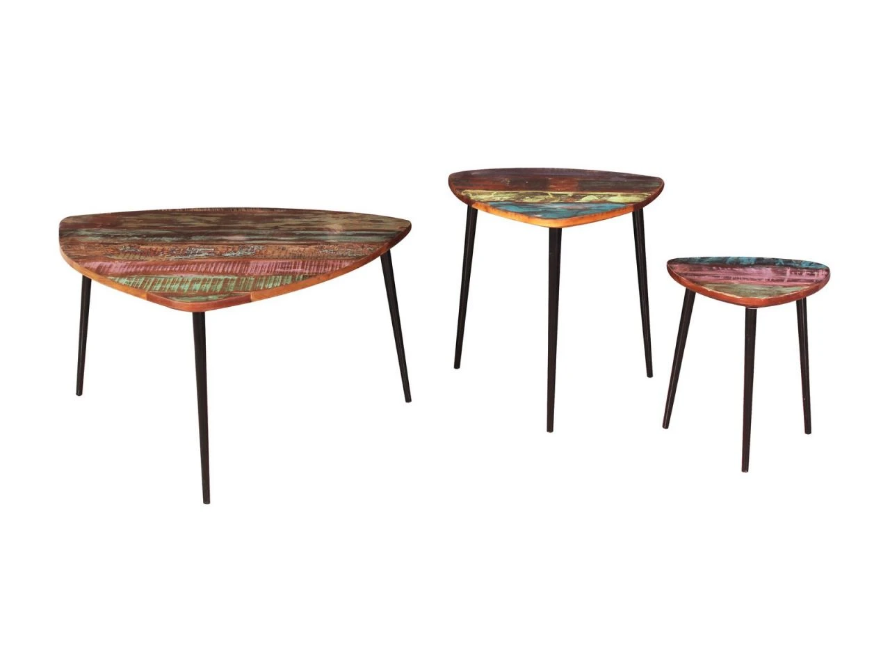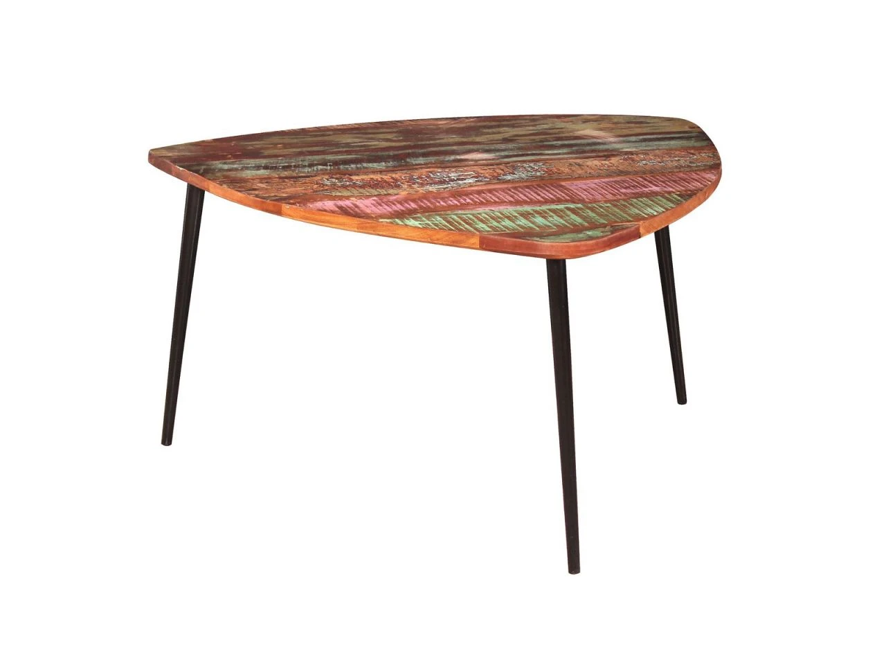 Dieser moderne Beistelltisch in einer Kombination aus Shabby Chic und Factory Design ist eine Bereicherung in jedem Ambiente. Die dreieckige Form mit abgerundeten Ecken mit 3 konisch zulaufenden Metallbeinen lassen ihn zudem etwas Retro wirken. Das Metall und das Holz wurden ebenfalls auf alt getrimmt, um ein stimmiges Bild zu erreichen, das recycelte Altholz ist in bunten Farben bemalt, so dass jedes Teil zum Unikat wird. Gerade in Kombination mit bereits vorhandenem Interior ist es sehr reizvoll und schon wenige Teile reichen, um ein völlig neues Ambiente zu erschaffen.