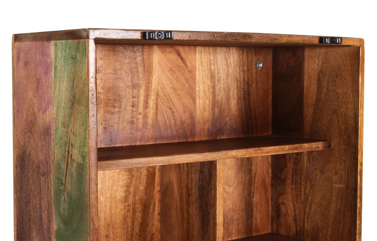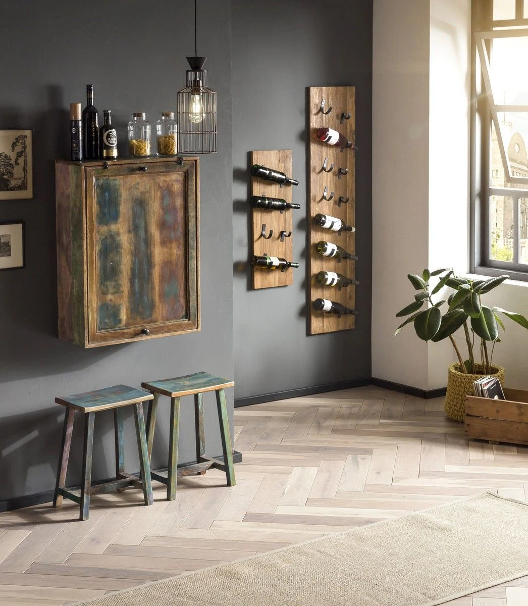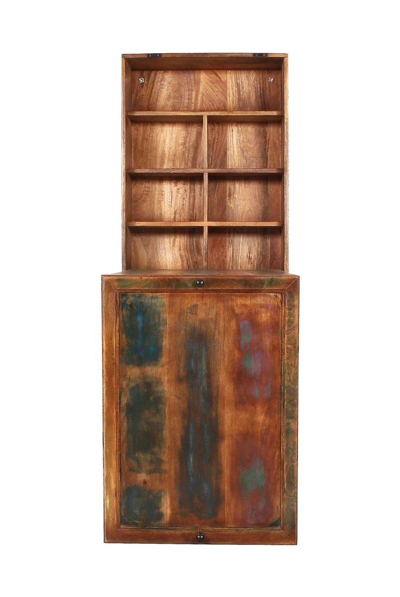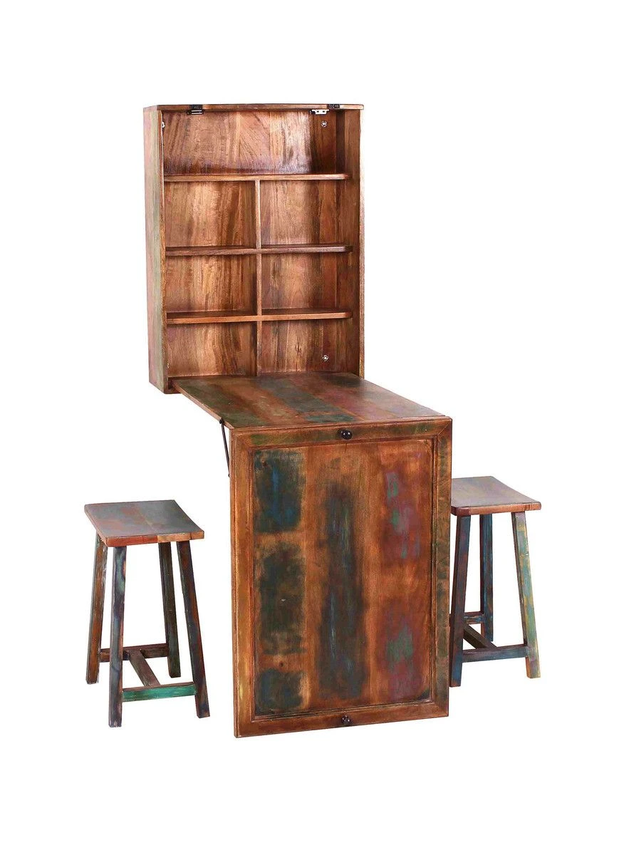 Ein praktischer Wandschrank mit zwei Hockern aus bunt lackiertem Altholz im Shabby-Chic. Sechs kleine Fächer und ein großes Fach bieten Ihnen Stauraum für übersichtliche Ordnung. Ein Boden ist herausnehmbar um Platz für Flaschen und andere höhere Dinge zu schaffen. Der Clou ist die Tür, welche sich zu einem kleinen Tisch aufklappen lässt. Dies ist ideal für kleine Küche oder andere Räume, wo Platz fehlt. Die Hocker verfügen über eine Holzsitzfläche und eine Mittelstrebe um die Füße darauf abzustellen.