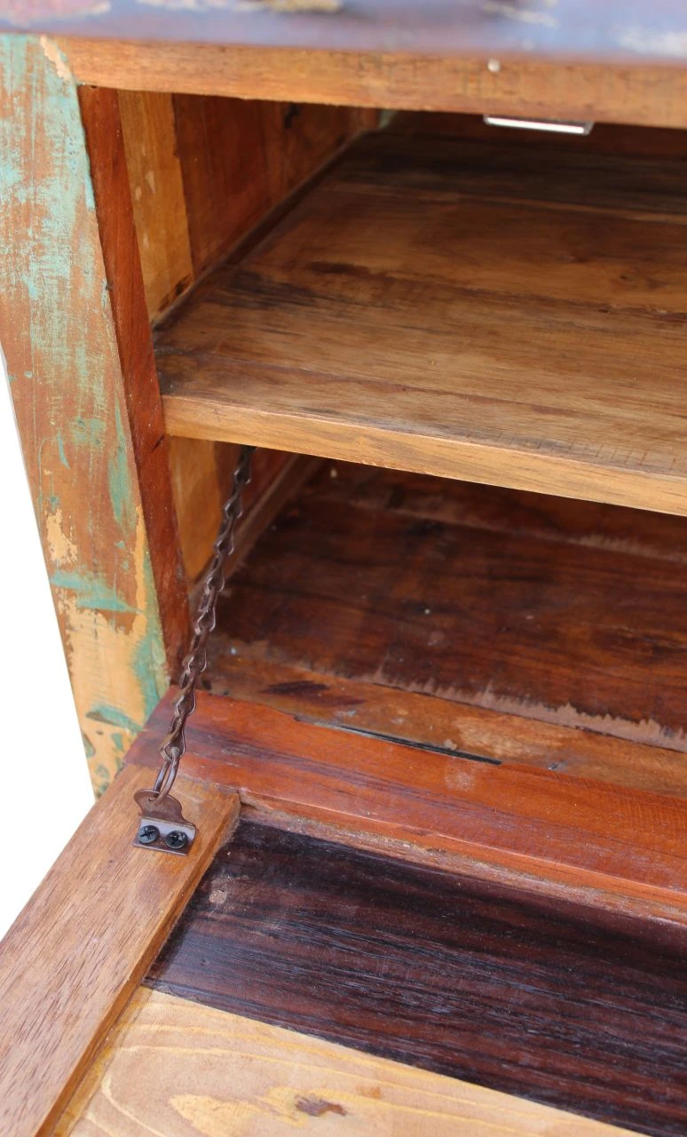 Holen Sie sich nicht nur Ordnung in den Eingangsbereich, sondern auch einen Hauch Urlaub. Der Schuhschrank überzeugt mit Charakter und Einzigartigkeit. Angefertigt aus buntem Altholz lädt der Stil zum Träumen ein. Hinter zwei Klappen und einer Schublade bietet sich genügend Platz für ca. 12 Paar Schuhe. Jedes Möbel bekommt durch den Verzicht auf moderne Hilfsmittel sein eigenes Gesicht – fernab unserer oft langweiligen Perfektion. Richtig integriert ergeben diese Möbel auch in modernem Ambiente ein besonderes Bild. Über herumliegende Schuhe müssen Sie sich nun nicht mehr ärgern. Hergestellt aus FSC-zertifiziertem Holz.