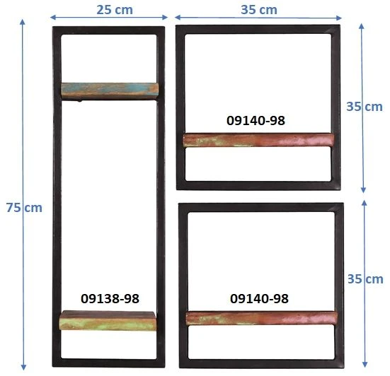 Dieses Set aus 3 Wandregalen mit bunt lackiertem, auf alt getrimmten recyceltem Holz und ebenfalls auf antik getrimmten Metallrahmen können Sie ganz individuell gestaltet aufhängen und somit Ihrer Kreativität freien Lauf lassen. Natürlich können Sie die Regale auch einzeln in verschiedenen Räumen verwenden, die Nutzung ist also äußerst vielseitig.