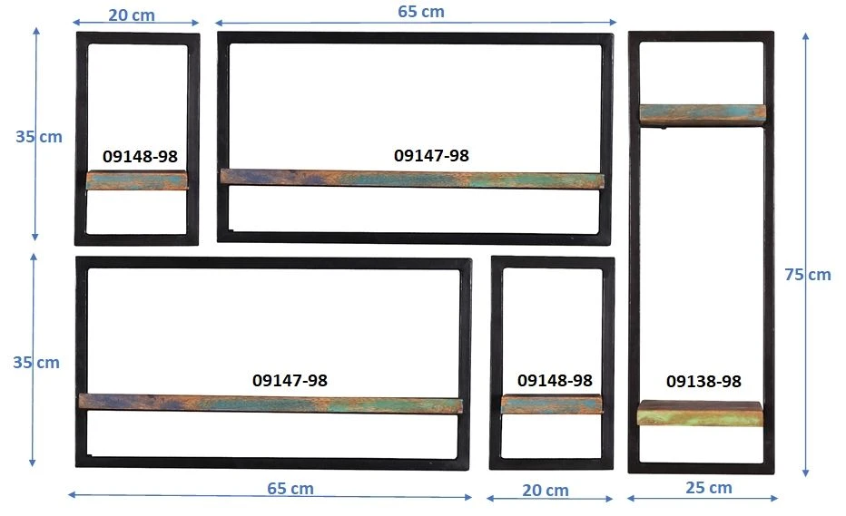 Dieses Set aus 5 Wandregalen mit bunt lackiertem, auf alt getrimmten recyceltem Holz und ebenfalls auf antik getrimmten Metallrahmen können Sie ganz individuell gestaltet aufhängen und somit Ihrer Kreativität freien Lauf lassen. Natürlich können Sie die Regale auch einzeln in verschiedenen Räumen verwenden, die Nutzung ist also äußerst vielseitig.