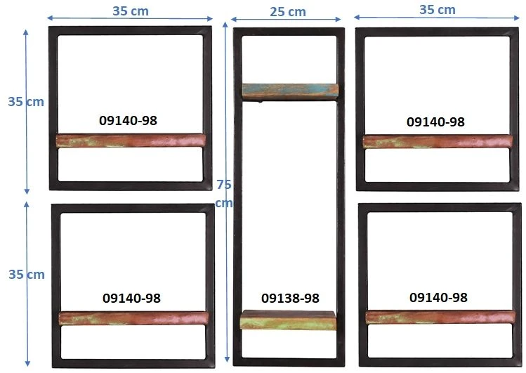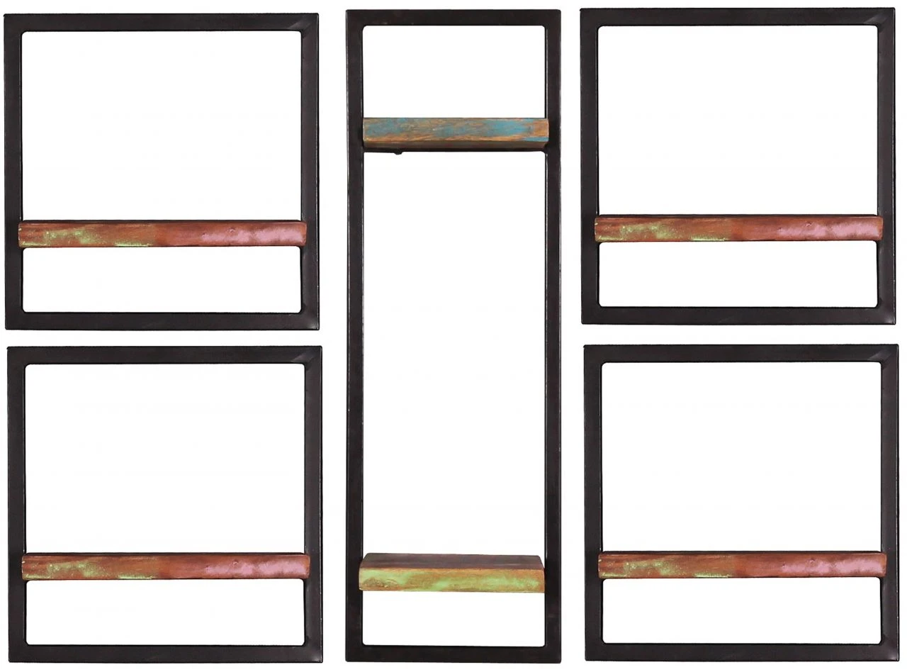 Dieses Set aus 5 Wandregalen mit bunt lackiertem, auf alt getrimmten recyceltem Holz und ebenfalls auf antik getrimmten Metallrahmen können Sie ganz individuell gestaltet aufhängen und somit Ihrer Kreativität freien Lauf lassen. Natürlich können Sie die Regale auch einzeln in verschiedenen Räumen verwenden, die Nutzung ist also äußerst vielseitig.