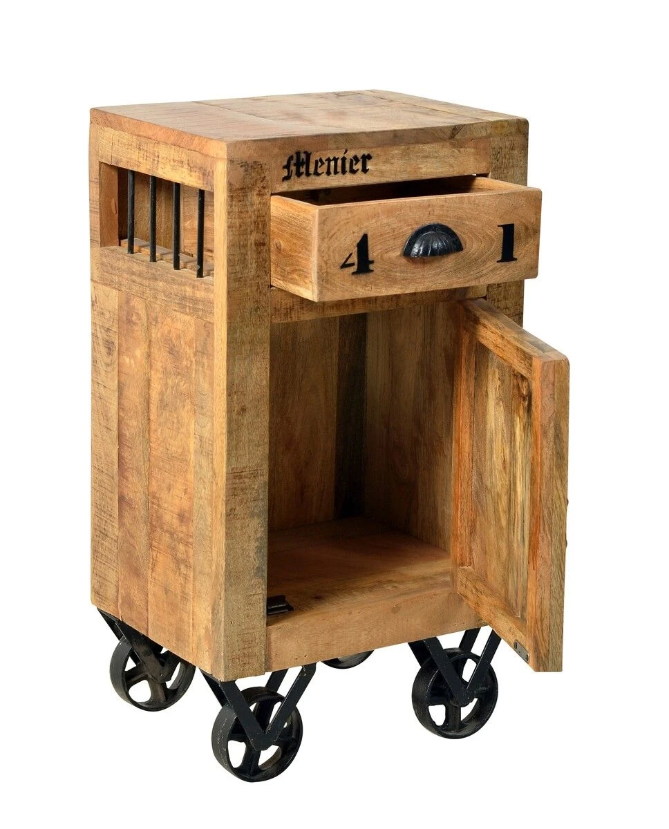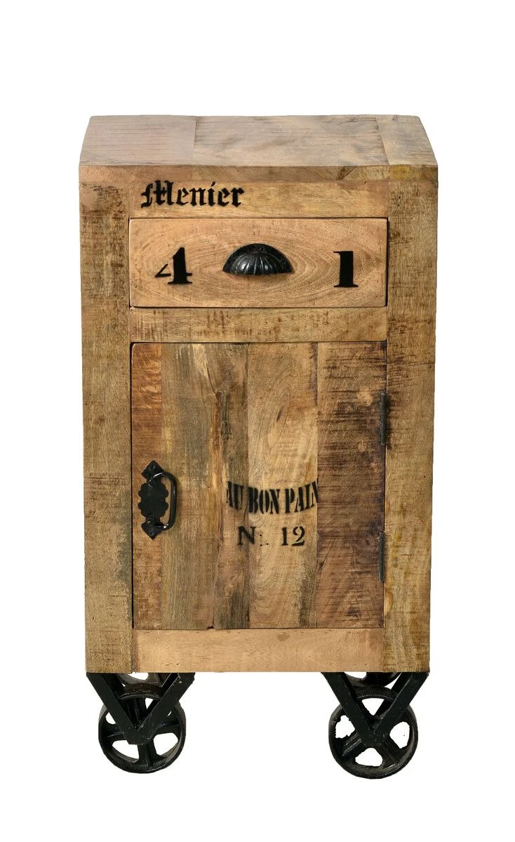 Die Kombination aus recyceltem Mangoholz und Metallbeschlägen in Antikschwarz verleihen der Kommode ihren rustikalen Charme. Das verwendete Holz stammt von alten Scheunen, Häusern und Reiströgen und ist besonders stark und widerstandsfähig. Durch die naturgemachte Witterung entsteht ein besonders warmer Farbton, der jeden Raum im Handumdrehen gemütlich macht. In einer Schubladeund hinter einer Tür bietet die Kommode jede Menge Stauraum, in denen z.B. Papiere und Kleinigkeiten Platz finden. Abgerundet wird der industrielle Look durch schwarze Aufdrucke, die an Transport- und Lagerkisten erinnern. Die handgeschmiedeten Rollen und Beschläge passen ideal in die industrielle Themenwelt, die diese Möbelserie erzählt. Durch die Rollen steht die Kommode leicht erhöht, was für einen luftig-leichten Look sorgt. Durch die natürliche Optik des Mangoholz passt die Kommode zu vielen Wohnstilen und kann z.B. in Wohnzimmer, Schlafzimmer oder Büro eingesetzt werden.