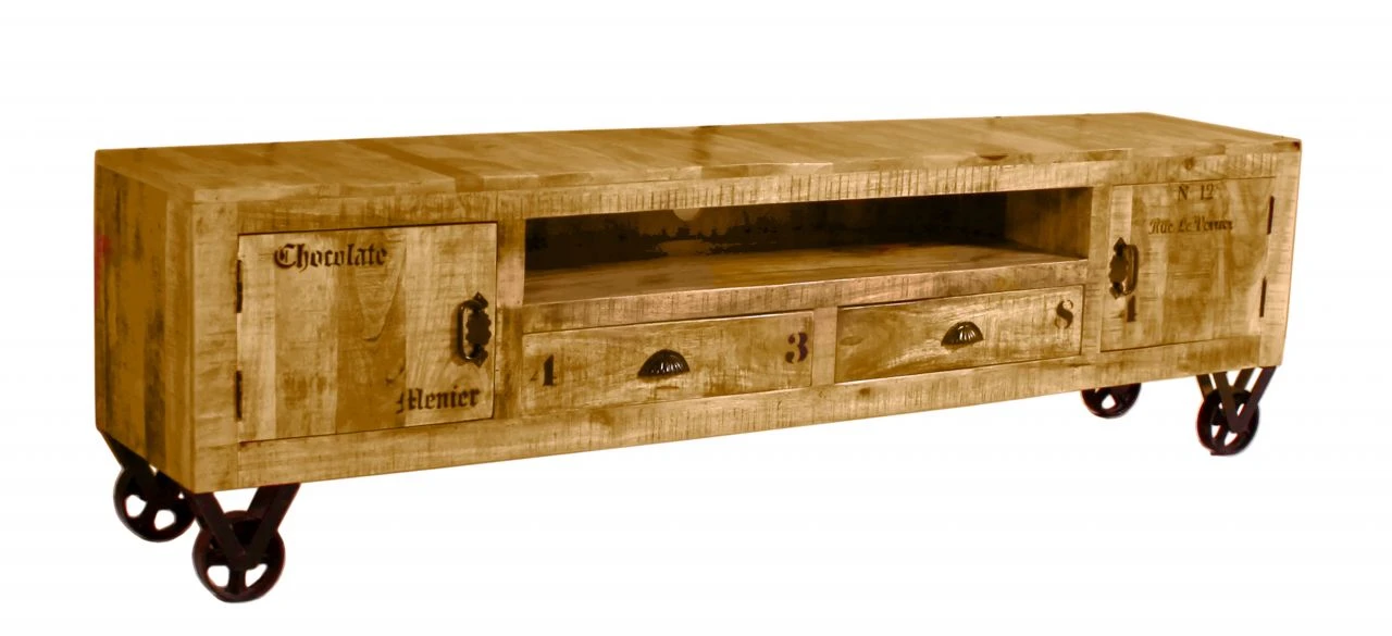 Die Kombination aus recyceltem Mangoholz und Metallbeschlägen in Antikschwarz verleihen dem Lowboard seinen rustikalen Charme. Das verwendete Holz stammt von alten Scheunen, Häusern und Reiströgen und ist besonders stark und widerstandsfähig. Durch die naturgemachte Witterung entsteht ein besonders warmer Farbton, der jeden Raum im Handumdrehen gemütlich macht. Das Lowboard bietet mit zwei Türen, zwei Schubladen und einem offenen Fach die ideale Kombination aus offenem und geschlossenem Stauraum mit Platz für HiFi-Geräte. Abgerundet wird der industrielle Look durch schwarze Aufdrucke, die an Transport- und Lagerkisten erinnern. Die handgeschmiedeten Rollen und Beschläge passen ideal in die industrielle Themenwelt, die diese Möbelserie erzählt. Durch die Rollen steht das Lowboard leicht erhöht, was für einen luftig-leichten Look sorgt. Durch die natürliche Optik des Mangoholz passt das Board zu vielen Wohnstilen und kann z.B. in Wohnzimmer oder Schlafzimmer eingesetzt werden.