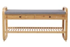 Stilvolle Schuhbank mit praktischer Sitzfläche – Diese Garderobenbank vereint Komfort und Stauraum auf moderne Weise. Das Gestell ist aus robustem und langlebigem Bambusholz gefertigt, optimal für die Ansprüche des täglichen Gebrauchs. Die weiche Polsterauflage macht das Flurmöbel nicht nur zur Möglichkeit bis zu 5 Paar Schuhe ordentlich zu verstauen, sondern vervollständigt die Bank zur komfortablen Sitzmöglichkeit. Vier Anti-kipp Stützfüße an den abgerundeten Kufen sorgen für einen besonders stabilen Stand. Zwei Schubladen bieten zusätzlich Stauraum für kleinere Garderobenaccessoires. Das schlichte Design aus natürlichem Bambus und grauem Stoff fügt sich dezent in jeden Flur ein.