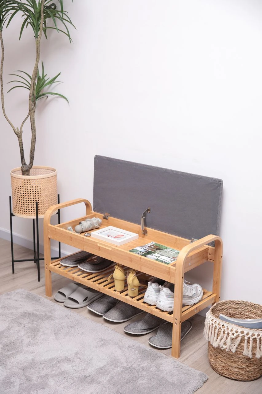 Stilvolle Schuhbank mit praktischer Sitzfläche – Diese Garderobenbank vereint Komfort und Stauraum auf moderne Weise. Das Gestell ist aus robustem und langlebigem Bambusholz gefertigt, optimal für die Ansprüche des täglichen Gebrauchs. Die weiche Polsterauflage macht das Flurmöbel nicht nur zur Möglichkeit bis zu 5 Paar Schuhe ordentlich zu verstauen, sondern vervollständigt die Bank zur komfortablen Sitzmöglichkeit. Zudem verbirgt sich unter dem aufklappbarem Sitzpolster versteckter Stauraum für die kleinen Dinge des Alltags. Das schlichte Design aus natürlichem Bambus und grauem Stoff fügt sich dezent in jeden Flur ein.