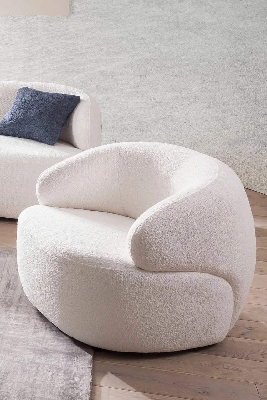 Der Cocktailsessel im modernen Bouclé-Gewand verbindet die aktuellen Wohntrends stilvoll miteinander. Gerundete, geschwungene Linien und weiche Stoffe machen den Sessel zum Lieblingsstück im Wohnbereich. Der Bouclé Stoff, der schon lange Einzug in unsere Wohn- und Schlafzimmer gehalten hat, vermittelt Wärme und Geborgenheit. Außerdem spiegelt der Stoff mit seiner wolligen Optik die Essenz des beliebten Scandi Styles gekonnt wider. Die üppigen Armlehnen mit weicher Polsterung sorgen für optimalen Sitzkomfort und fassen dden Sessel zusätzlich gemütlich ein. Kleine Kunststofffüße sorgen für einen wackelfreien Stand.