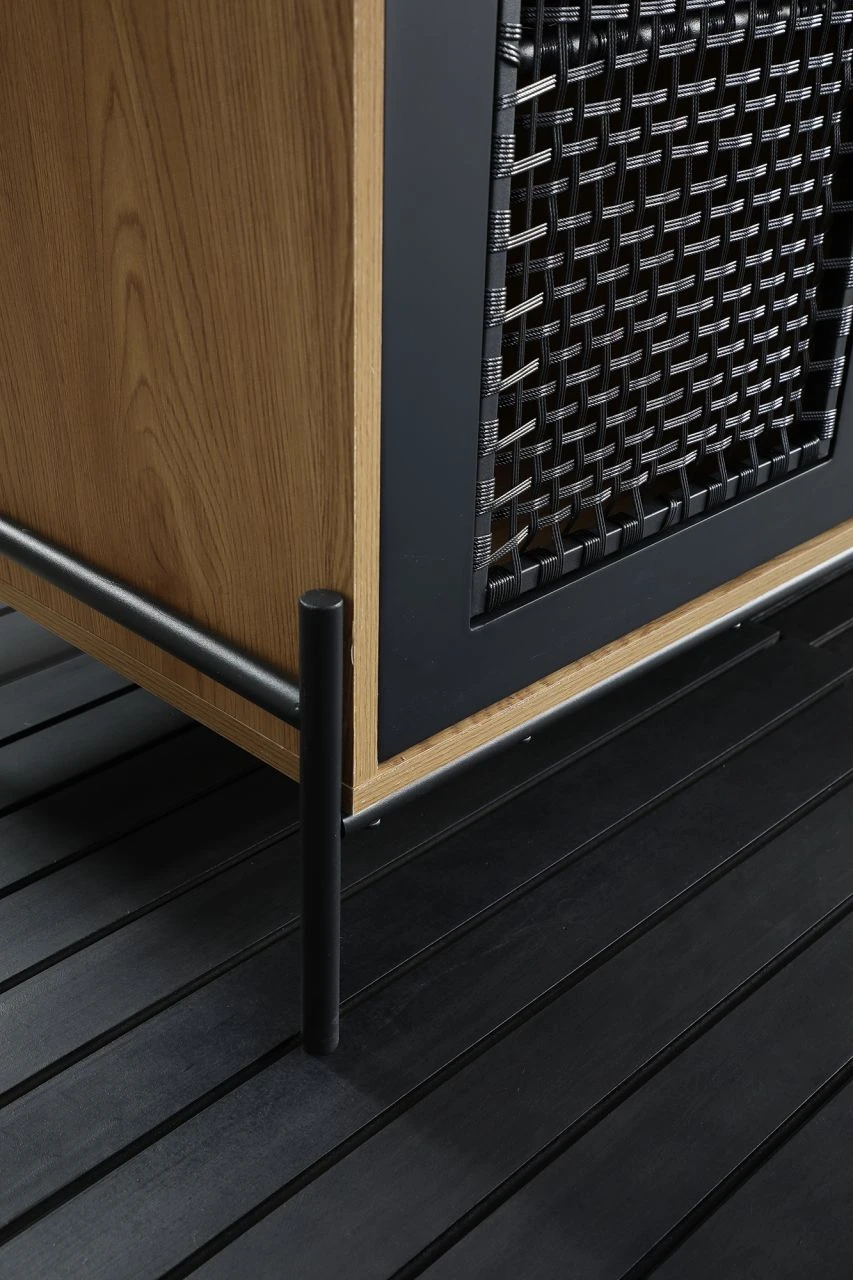 - Türen aus Melamin, matt lackiertem Holz und Einsatz aus schwarzem Polyrattan