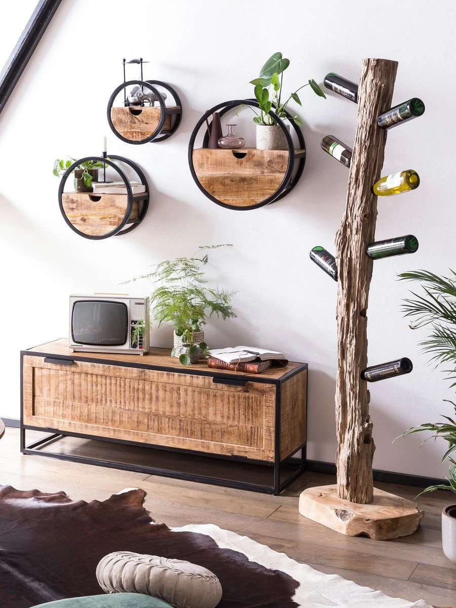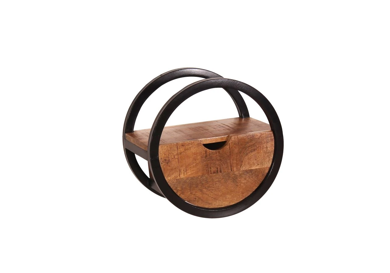Dieses zauberhafte Wandregal hebt sich von der Masse ab. Das runde Regal aus naturfarbigem Mangoholz und einem antikschwarzen Metallrahmen können Sie ganz individuell gestaltet aufhängen und somit Ihrer Kreativität freien Lauf lassen. Der Industrial-Look ist dabei ein absoluter Eyecatcher. In der Schublade finden kleinere Dinge ihren Platz, auf der Ablage können Sie Dekoartikel platzieren. Das Massivholzregal ist vielseitig einsetzbar und kann in vielen Räumlichkeiten genutzt werden.