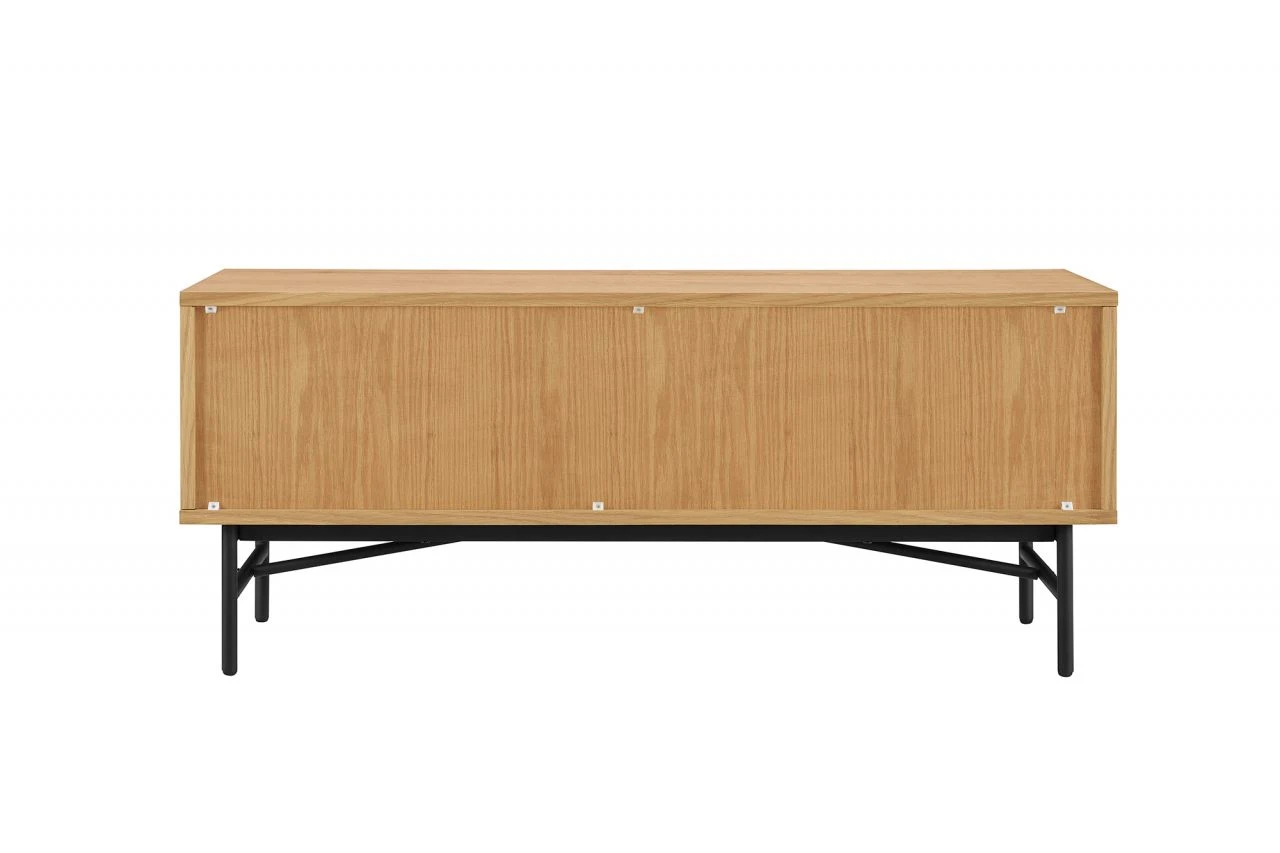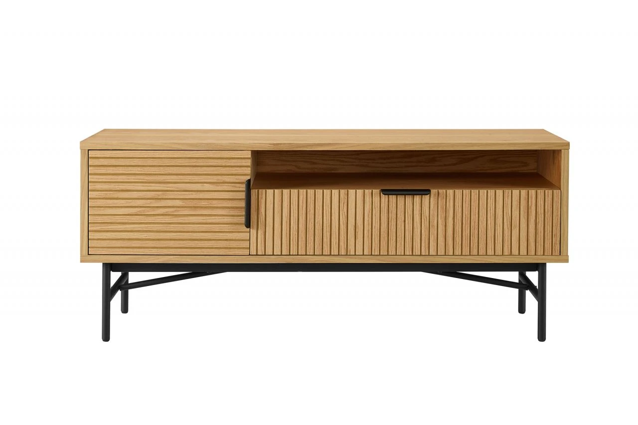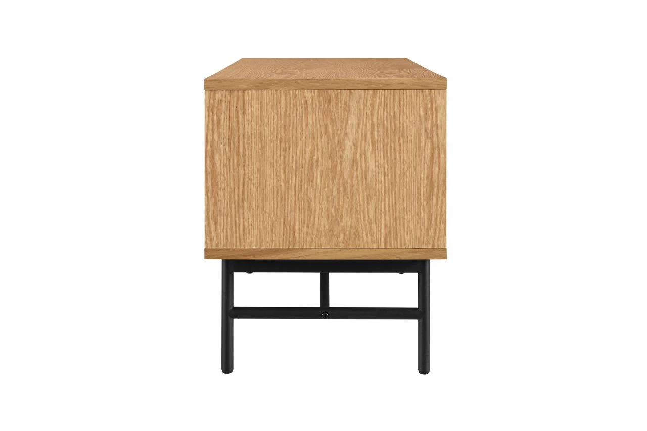 - Front: MDF (Mitteldichte Holzfaserplatte), furniert (Holzart: Eiche), Rückwand: Melamine Eichefarben, Gestell: Metall pulverbeschichtet Schwarz, Korpus mit kratzfester PU-Lackierung, mit Kabelführung, für TV bis 55 Zoll geeignet